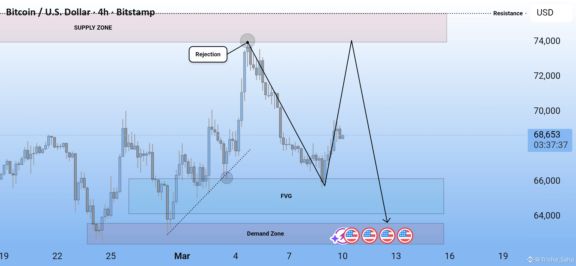 Invalidation: A surprising recovery and daily close above the $74,000 Supply Zone would negate the "drop" thesis and open the door for a move toward $80,000.