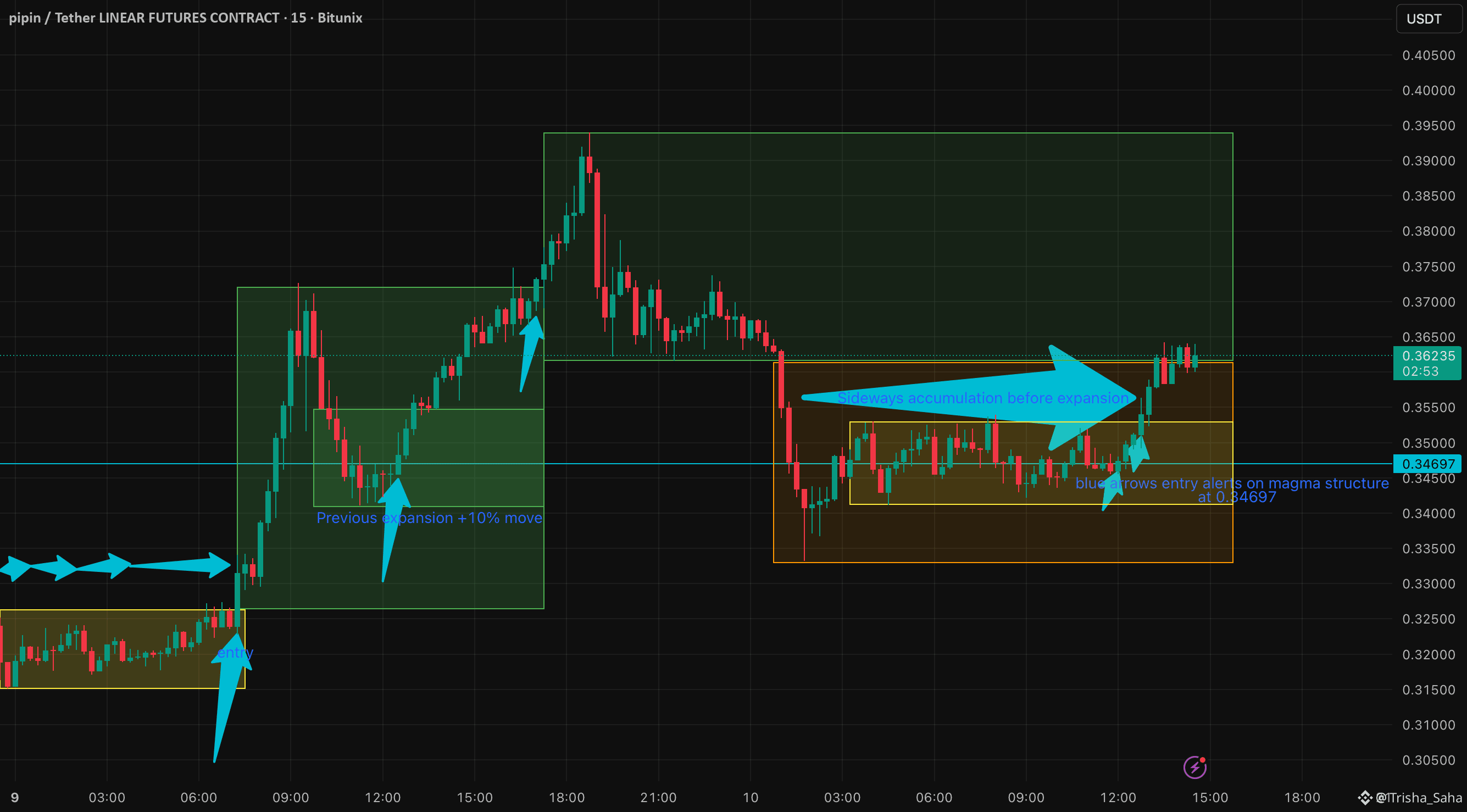 The Precision Entry: The system identified a high-probability Long Entry near the accumulation floor at 0.34697. This level served as a critical launchpad for the ensuing move. 🎯