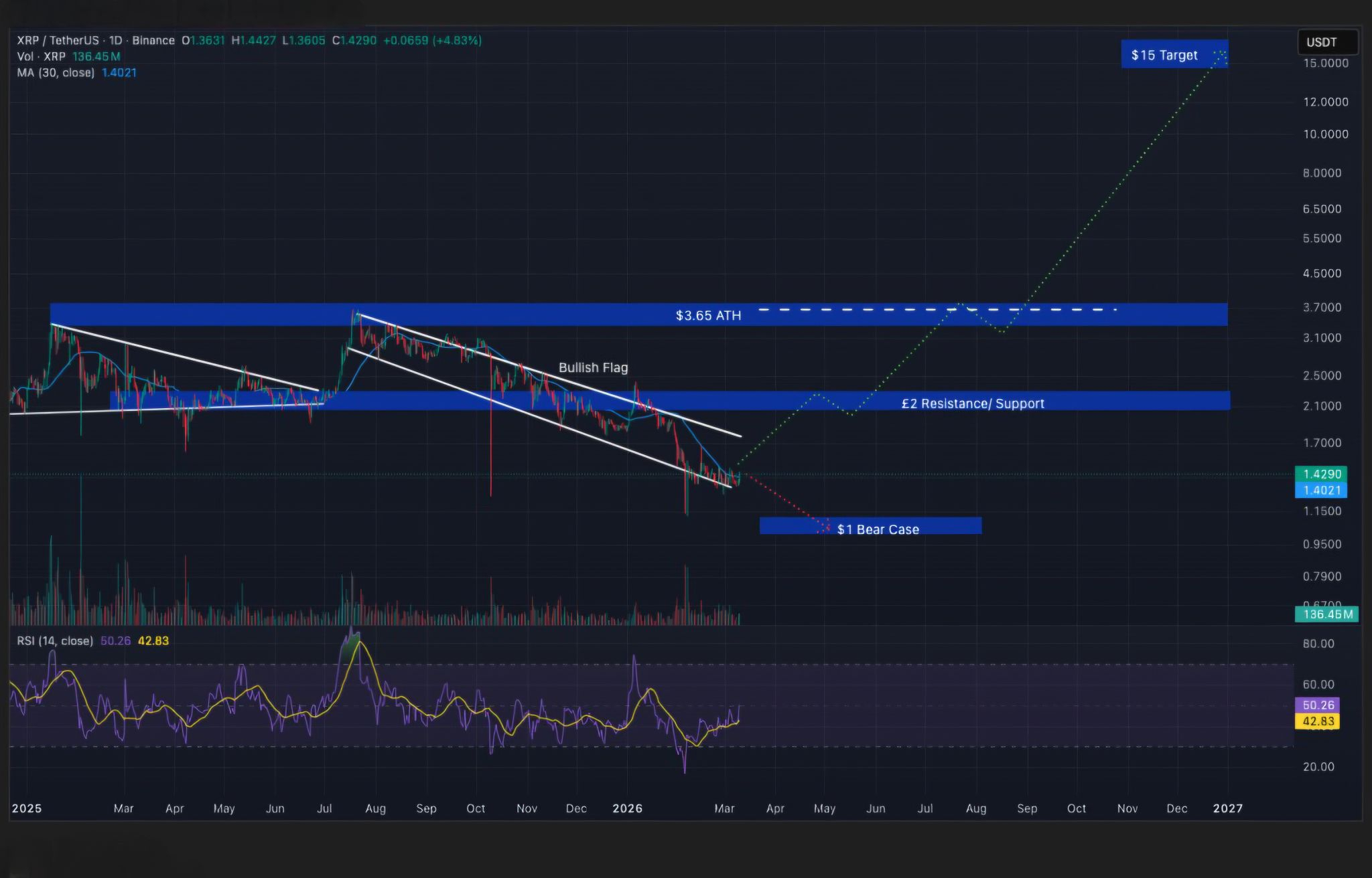 Technical signals also show stronger momentum. XRP’s recent support and resistance levels are forming a bullish flag pattern, which often appears before a major price breakout.