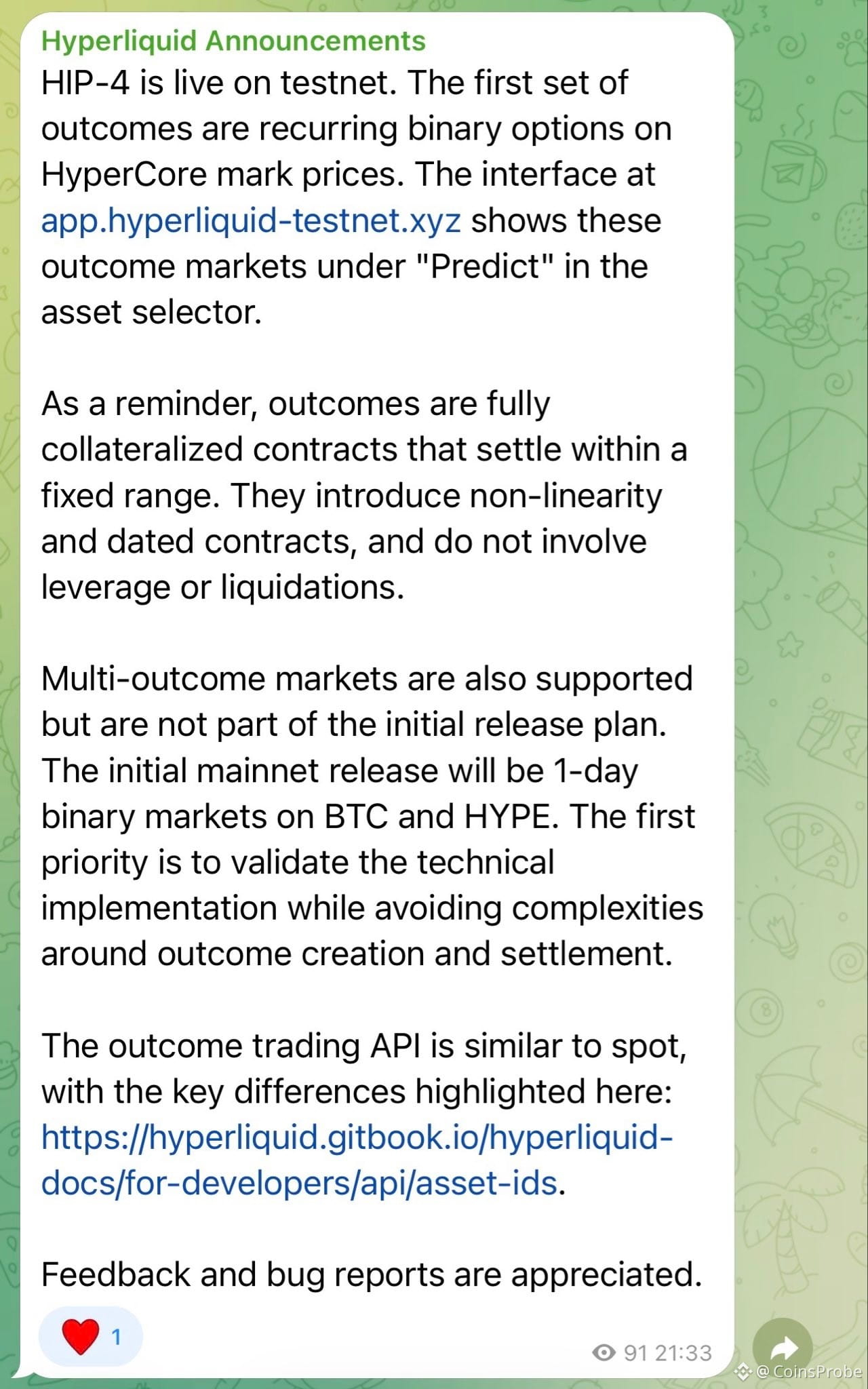 While HIP-3 focuses on open-ended perpetual markets, HIP-4 introduces a different trading model centered on fixed outcomes.