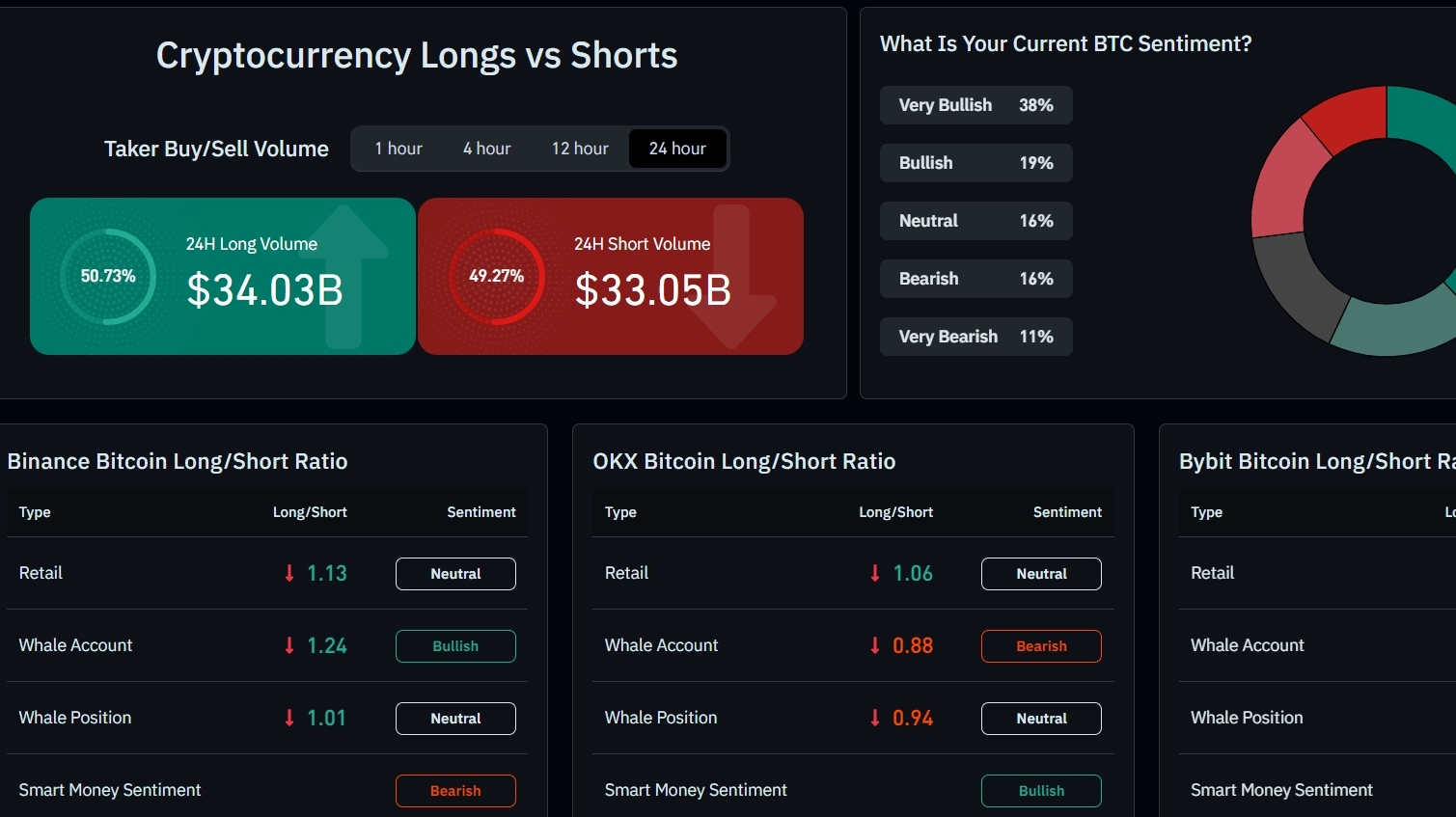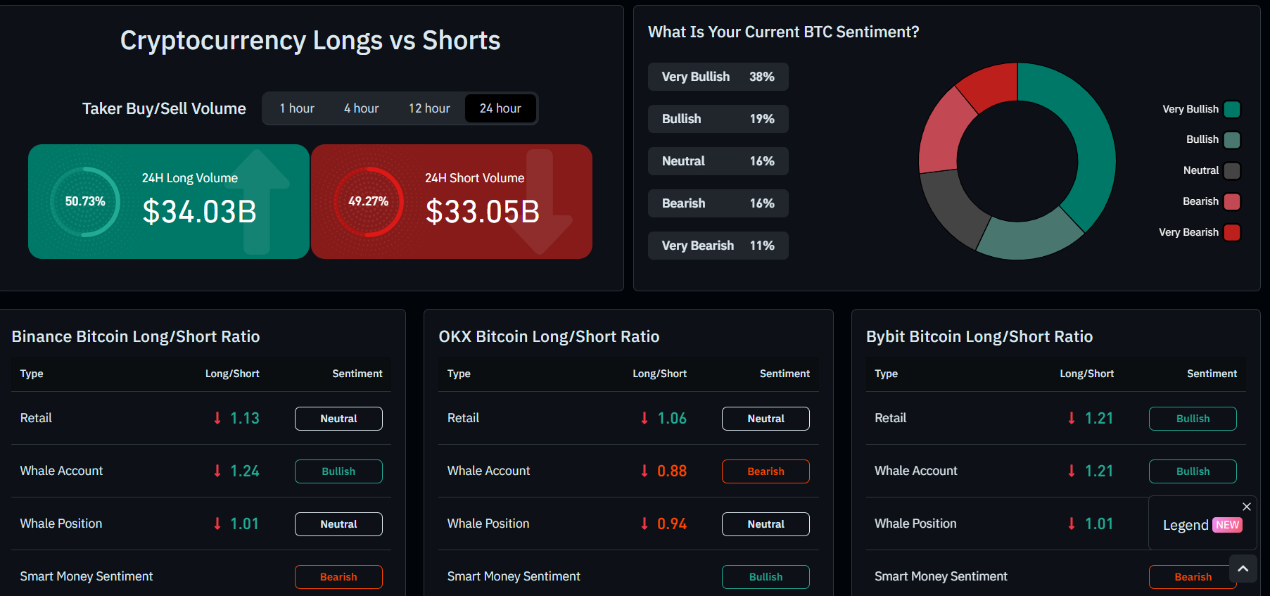 The overall 24-hour taker buy/sell volume is almost balanced, with longs at 50.73% ($34.03B) and shorts at 49.27% ($33.05B), indicating no strong directional bias in the immediate term.