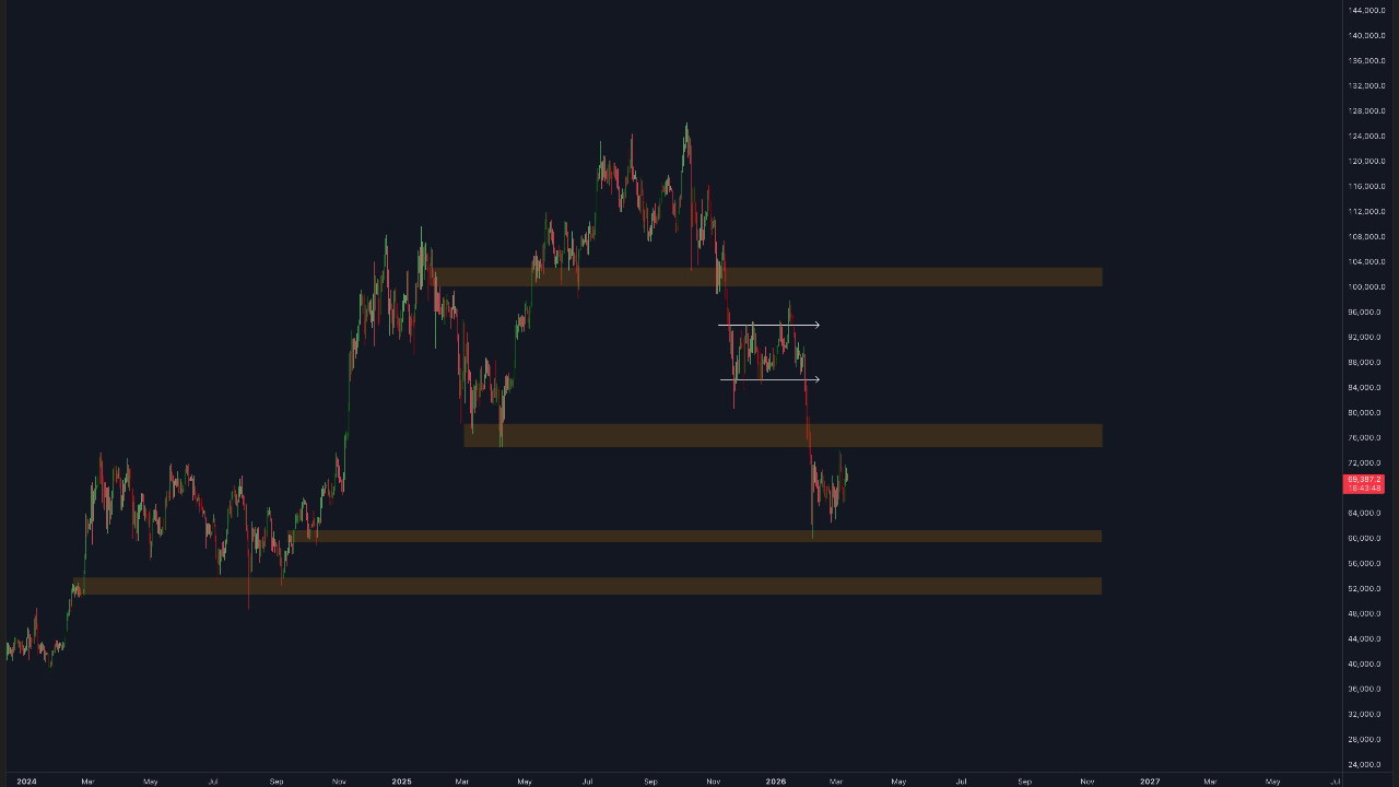 Currently, BTC is in the middle of the Range (~$70k). In trading, this is the most dangerous zone because: