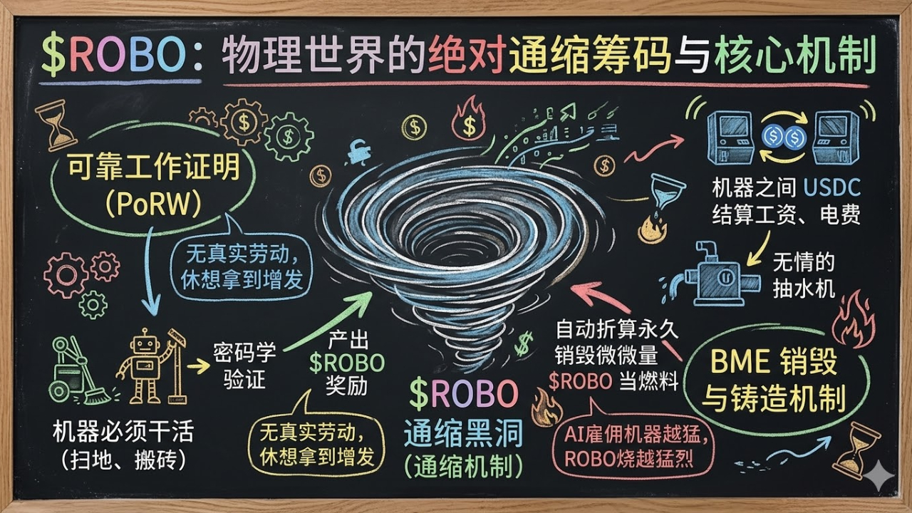 Secondly, this is also the most ruthless point I think, called the BME destruction and minting mechanism. Machines settle wages and electricity fees using USDC, and behind every seemingly tiny payment, the underlying protocol automatically converts and permanently destroys small amounts of ROBO as network fuel.