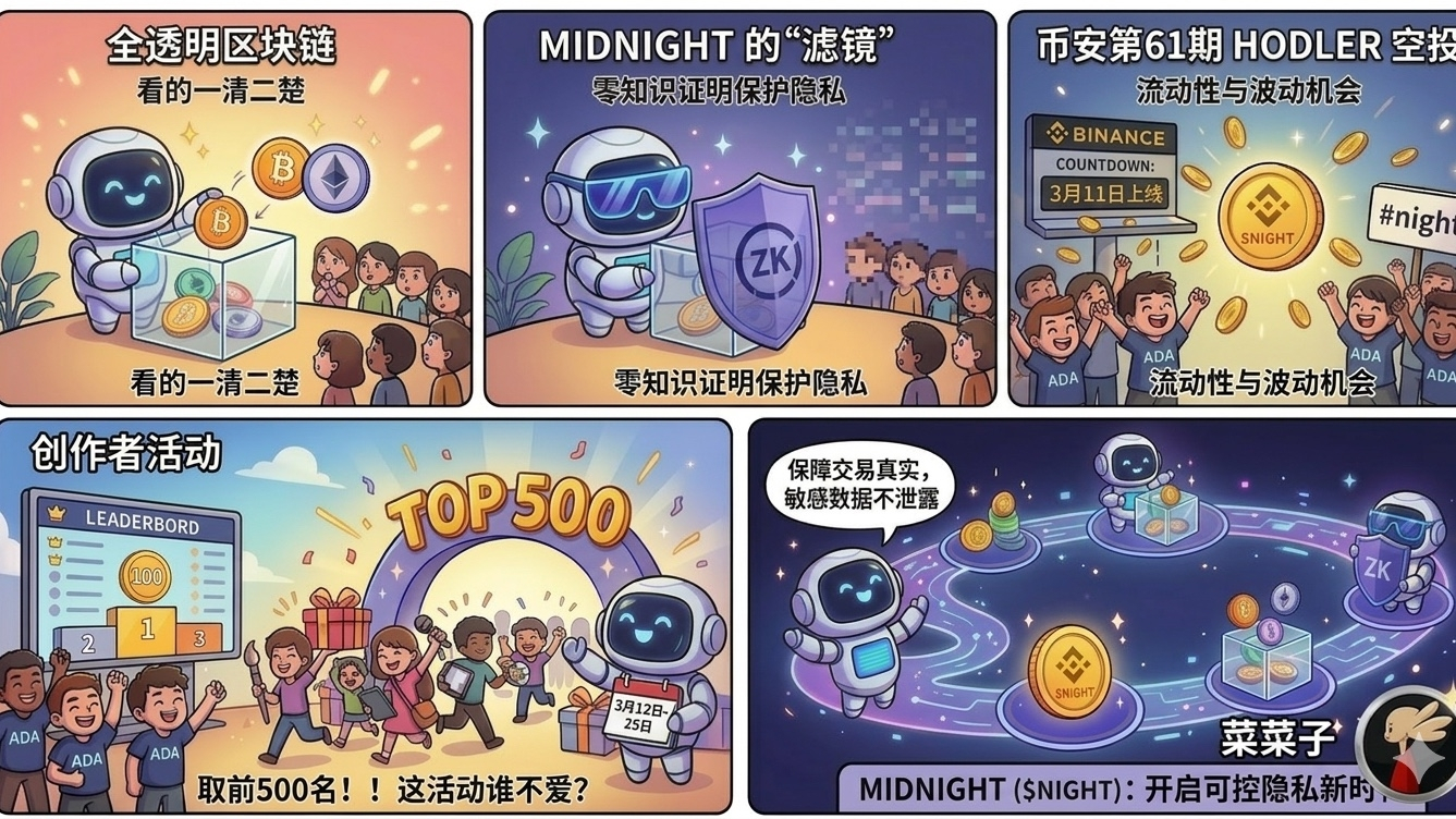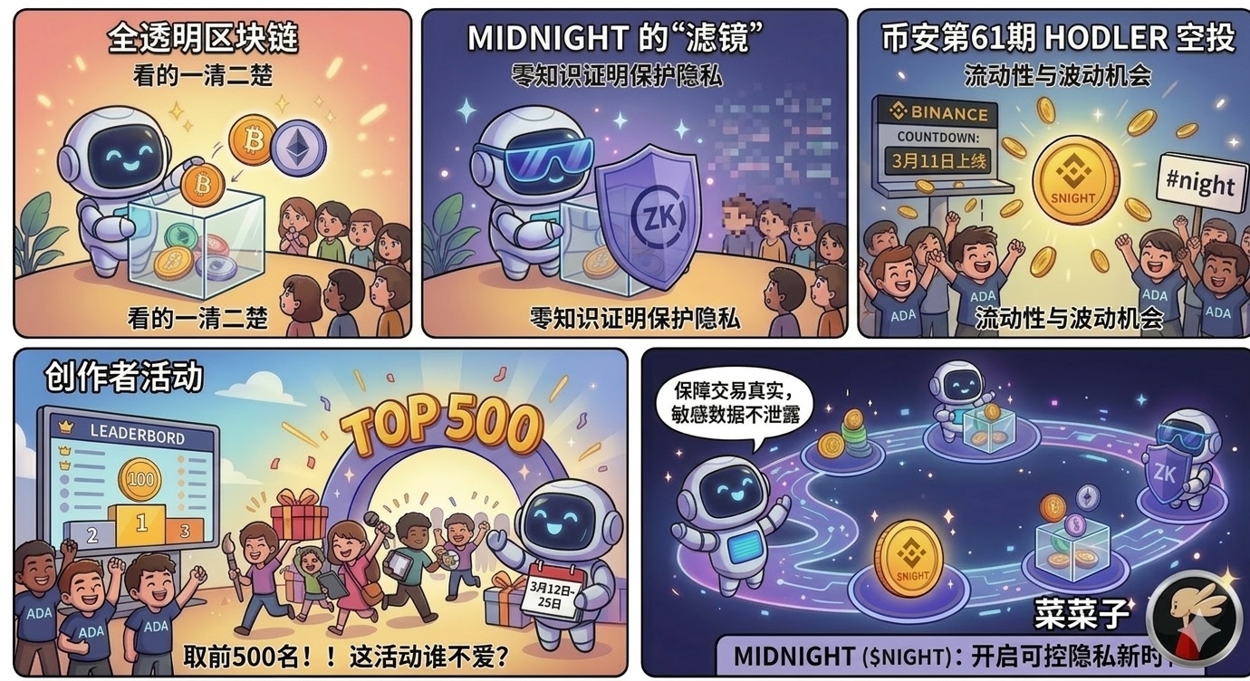 It doesn't matter if you missed it; NIGHT will officially launch trading on March 11. As the 61st HODLer airdrop project from Binance, those holding BNB are already laughing. Just hitting the big exchange, volatility is an opportunity; those who understand know what to do. Don't just watch the show; this wave of Midnight (NIGHT) also includes creator activities where the first 500 can receive rewards. Nowadays, project teams often only reward the top 100, which is reserved for the big V; Midnight (NIGHT) is quite generous with 500 spots (March 12-25) and the time frame is quite ample. If you have time and energy, you can start charging ahead.