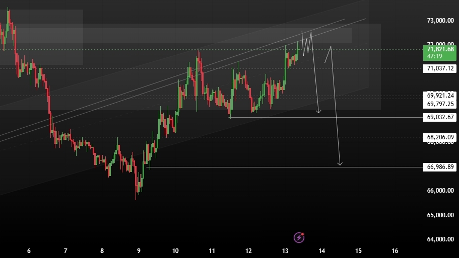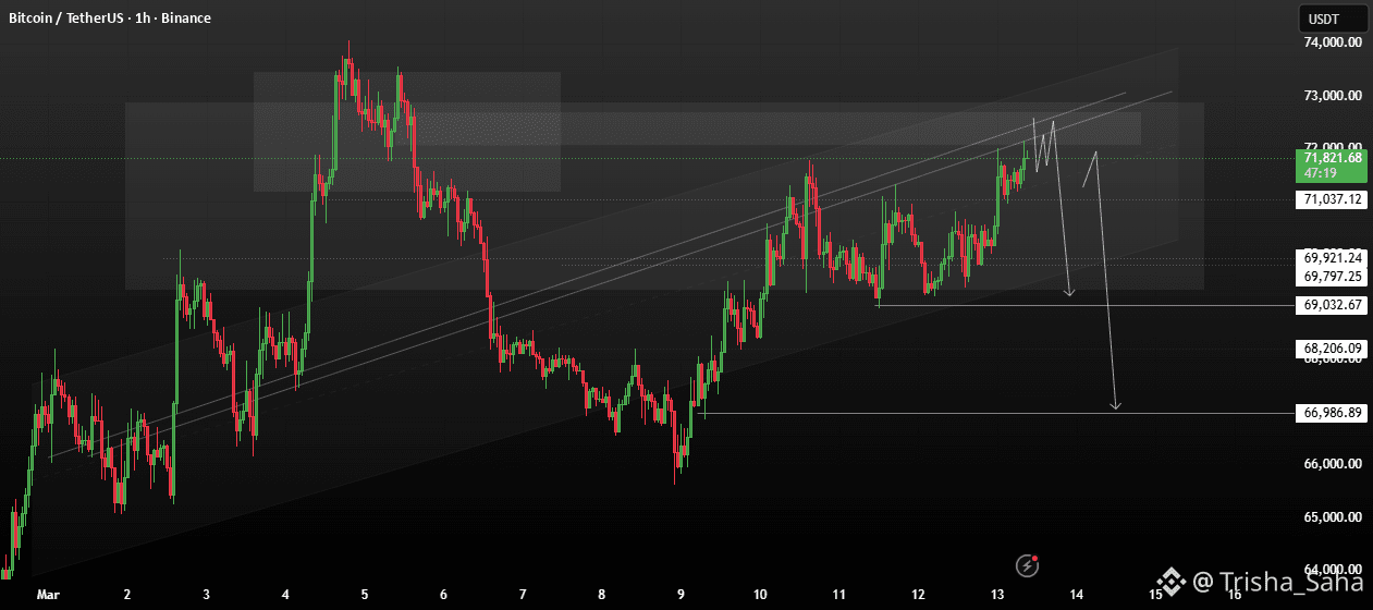 Bitcoin the area around 72,000 – 73,000 is acting as a strong supply zone where sellers previously entered the market. Each time price approaches this region, buying pressure begins to fade, suggesting that large market participants may be positioning for a potential downside move.