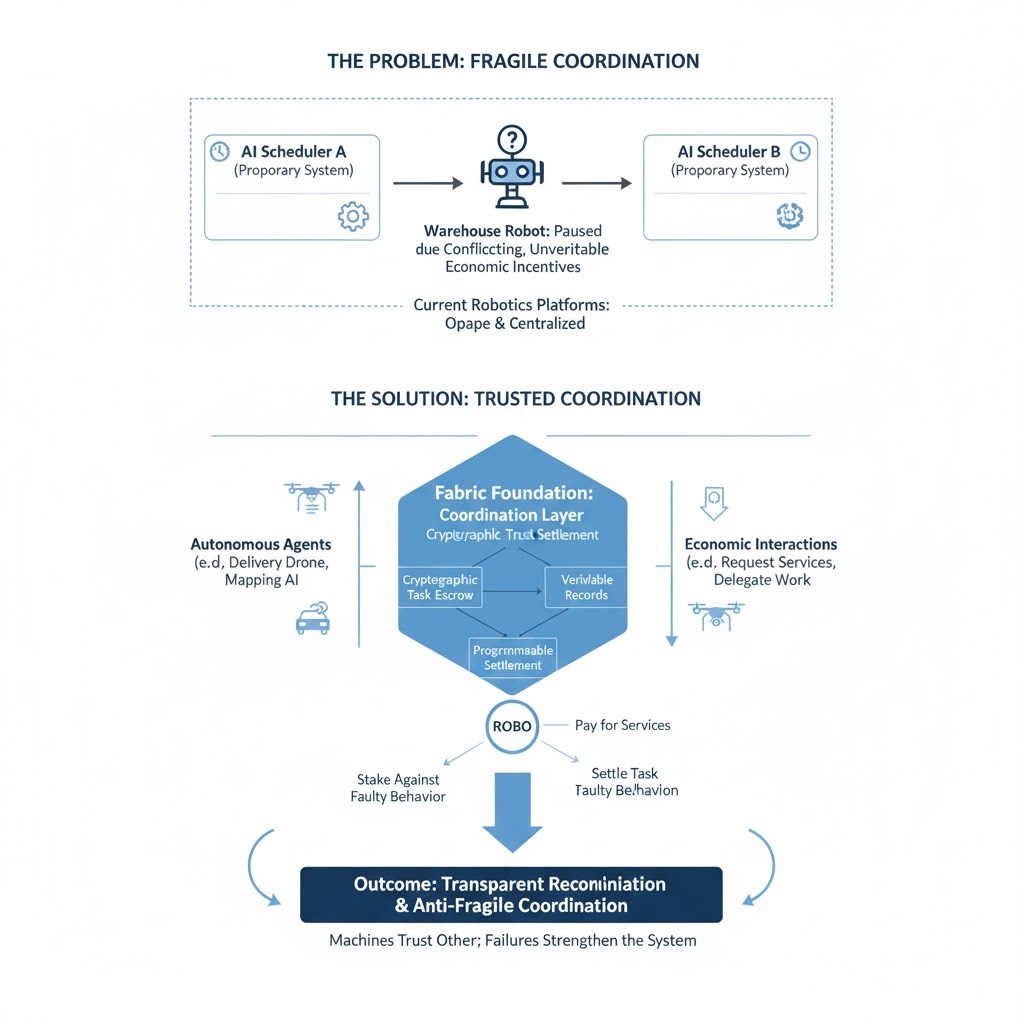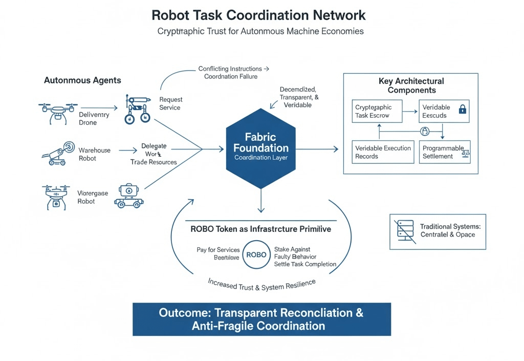 This is why some of the architecture around @Fabric Foundation has been interesting to watch. Instead of treating robotics purely as a software challenge, the system frames coordination itself as the missing layer, using cryptographic task escrow, verifiable execution records, and programmable settlement to allow machines to confirm that work actually occurred.