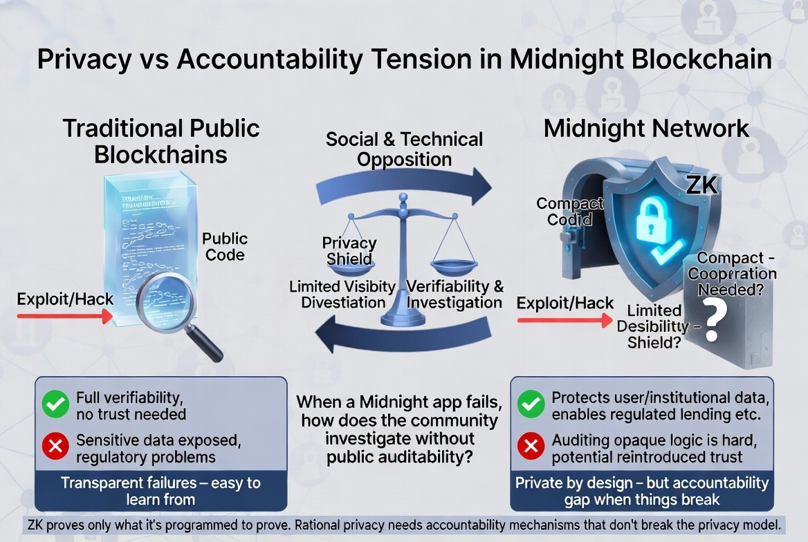 Traditional blockchains are "ugly" when they fail, but they are transparent about how they fail. Every transaction and state change sits on a public ledger that independent analysts can examine. Exploits get reconstructed, postmortems get written, and the community learns because the evidence is visible. Midnight’s confidentiality controls, by design, limit that visibility. The very feature that protects user data in normal operation becomes a massive obstacle to accountability when something breaks.