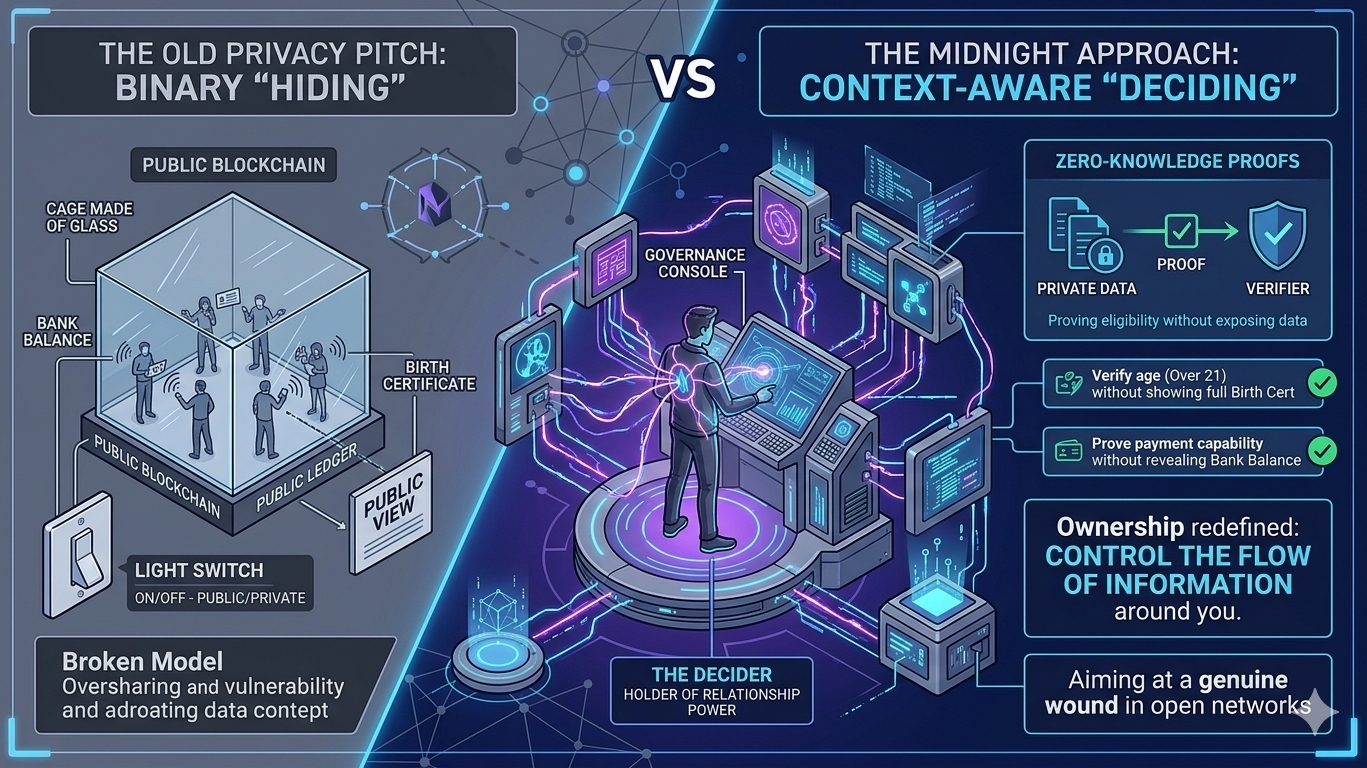 What Midnight is reaching for is heavier. It is treating ownership like the ability to control the flow of information around you. Not just the assets. The story. The context. The visibility. Because in digital systems, the person who decides what gets seen and what stays hidden is the person who actually holds power. That is a different kind of ownership. That is ownership over relationship, not just custody.