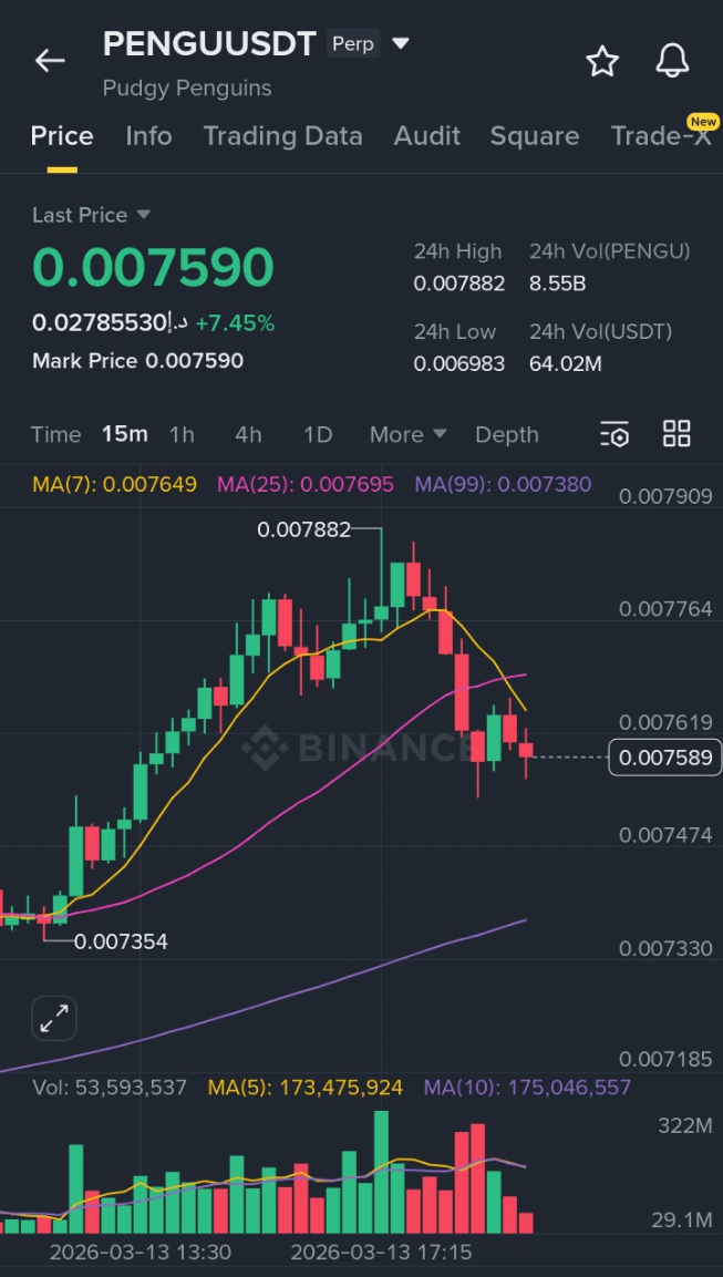 Pudgy Penguins’ native token $PENGU is currently showing short-term correction signs after a strong intraday push. Recently, the token has been trending across crypto markets due to rising ecosystem hype and notable trading activity. Some reports show the token posting ~6–7% daily gains and strong market-cap momentum, reflecting growing investor interest.