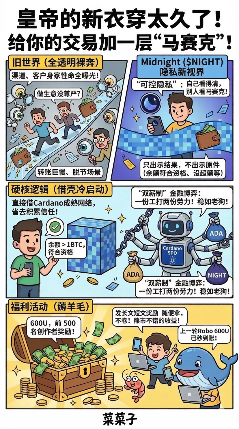 Later, when I saw the controllable privacy options proposed by Midnight, I felt that this project might meet my needs. There are no difficult formulas; it simply gives you a system that you can see clearly, but to others, it looks like it has a layer of mosaic. You need to prove that you are powerful and wealthy, and the system helps you prove it, but how big your trump card is remains in your own hands; only you know. I think this method of hiding everything and only displaying the part you choose is what those so-called old-fashioned privacy coins lack, rather than those things that are private for the sake of privacy with no practical application scenarios.