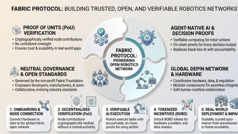 This circular diagram breaks down Fabric’s core pillars perfectly: Proof of Units verification, agent-native AI with on-chain proofs, neutral governance by the non-profit foundation, and a global DePIN network for hardware coordination. Love how it shows the trusted, verifiable flow from onboarding to real-world impact.