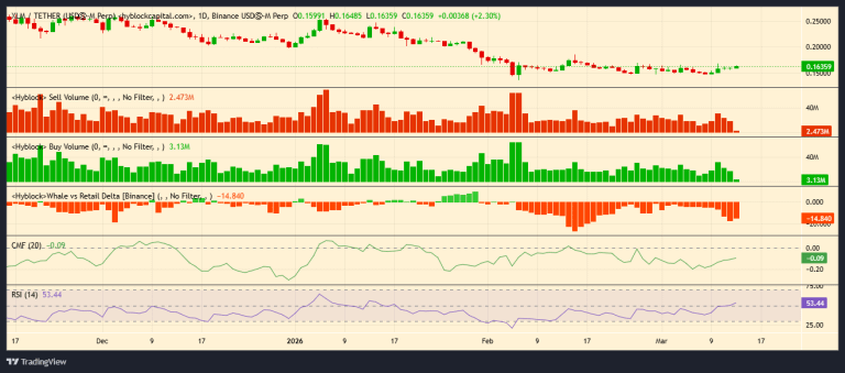 Whale vs Retail Delta at -14.840 suggests large holders may be selling into retail demand.