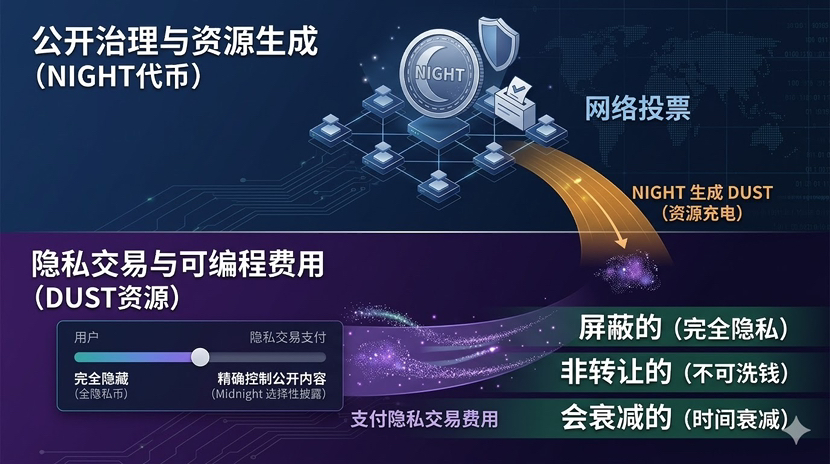 NIGHT is a public governance and capital token. Holding NIGHT allows participation in network governance voting, while NIGHT will automatically 'generate' DUST—it's like 'charging' your privacy usage rights.