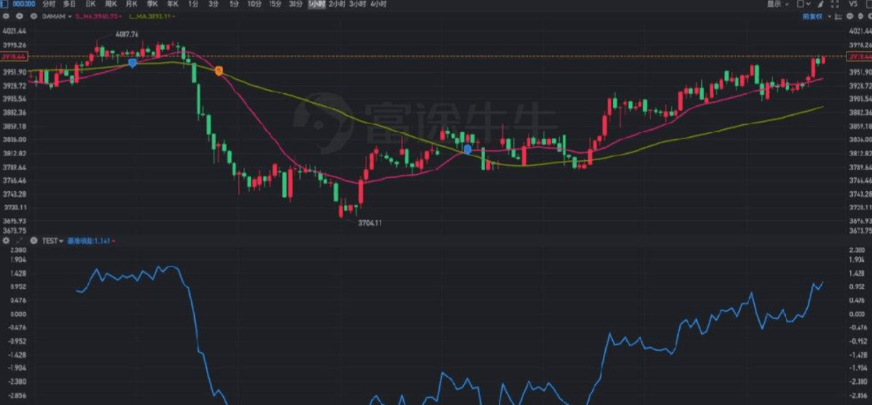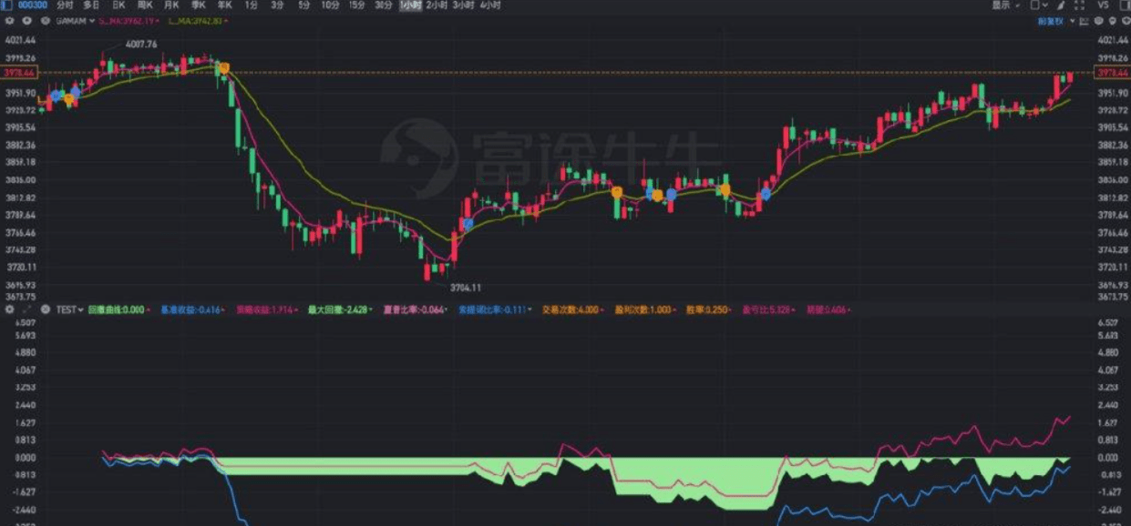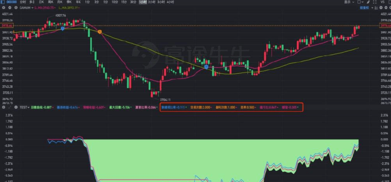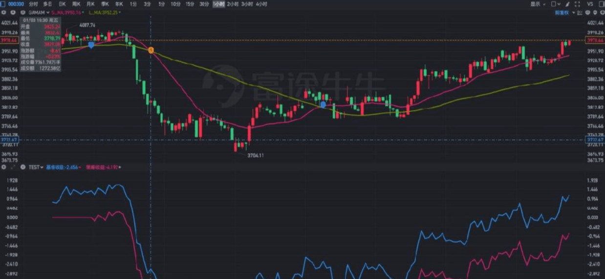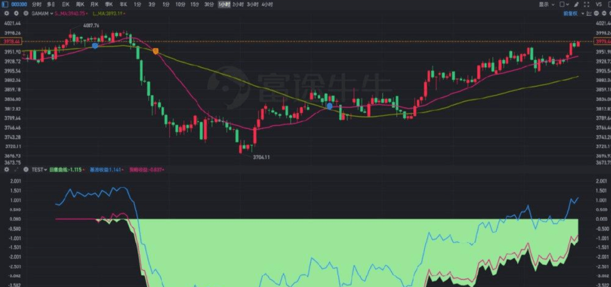 For example, using the double moving average code above, we start from Christmas of 2024 and backtest the effect of the CSI 300 index at the hourly level.