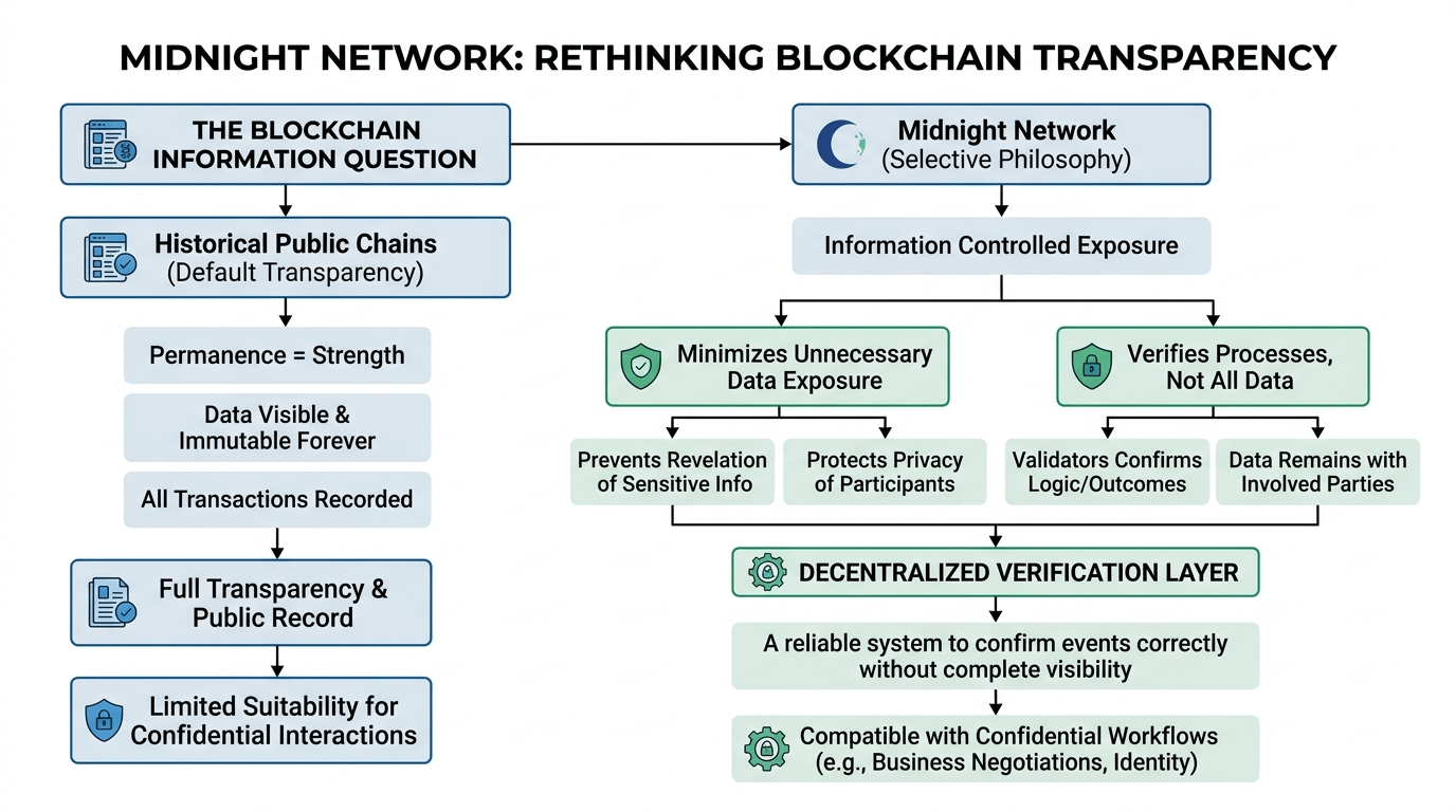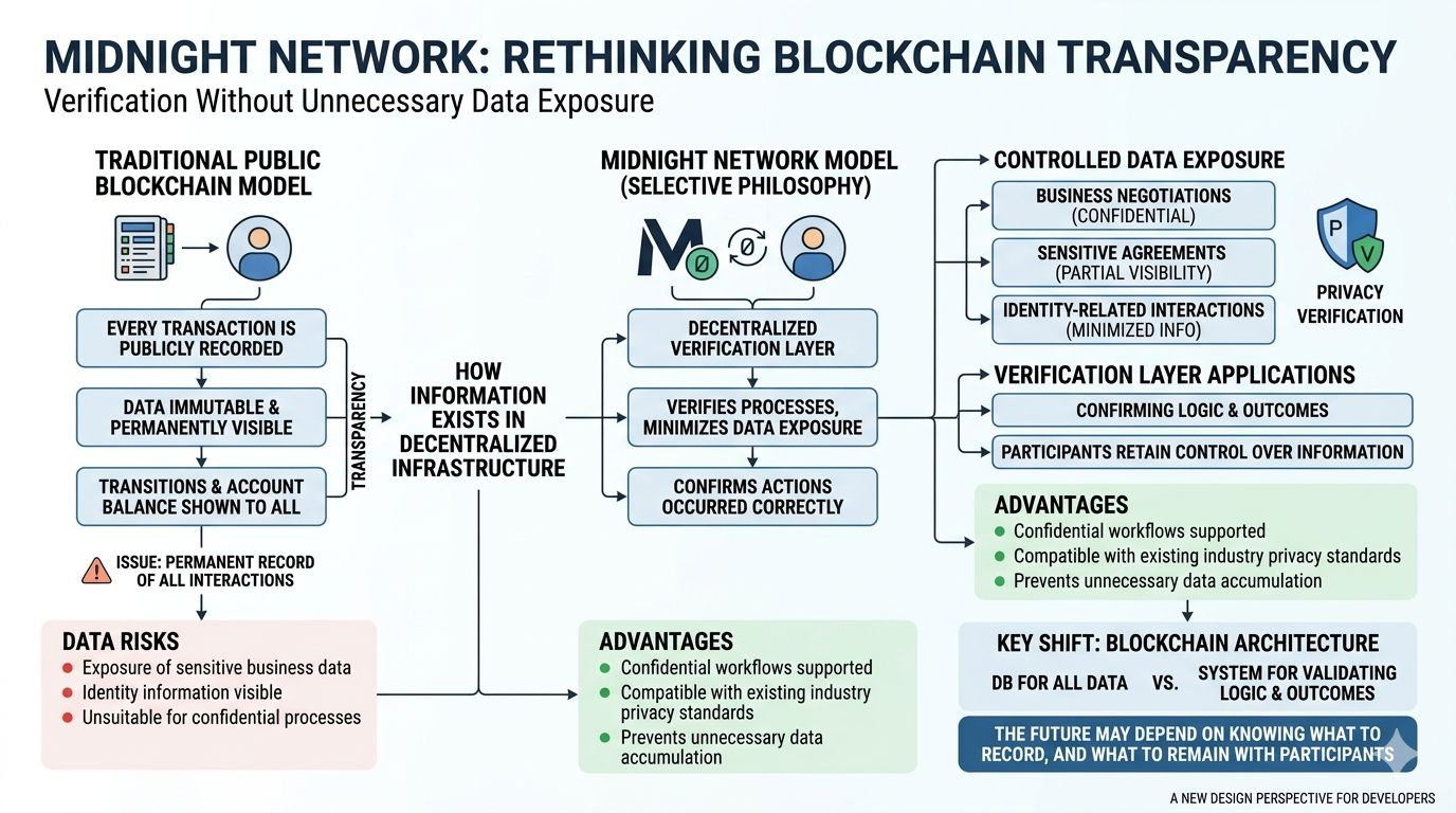 Instead of focusing only on how quickly data can move through a system, Midnight appears to be examining how information itself should exist inside decentralized infrastructure. Public chains historically treat data permanence as a strength. Once something enters the ledger, it remains visible and immutable forever. That design supports transparency, but it also creates a permanent record that may not always be appropriate for every type of interaction.
