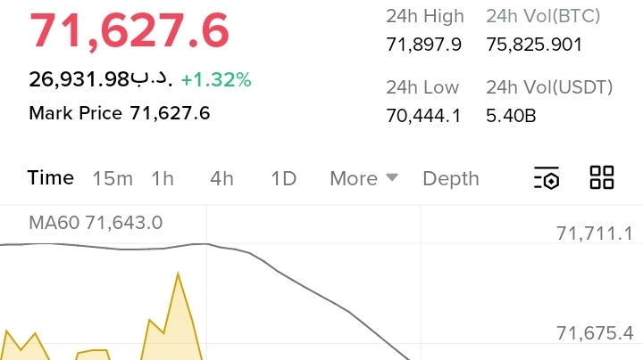 $BTC Bitcoin is currently maintaining a strong position in the market, trading around $71,627. Over the past 24 hours, the market has shown a healthy range, with a high of $71,897 and a low of $70,444. This range indicates that traders' interest remains strong and liquidity in the market is also robust.