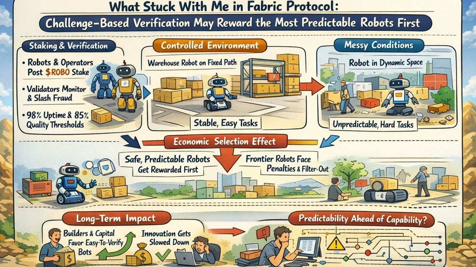 The more I look at Fabric, the more I think the real question is not whether it can verify robot work. It is whether its verification economics can reward ambitious capability without forcing everything to behave like factory-grade predictability. If the answer is no, Fabric Protocol will still scale robots. It just may reward the safest ones first, and mistake that for the whole future.
