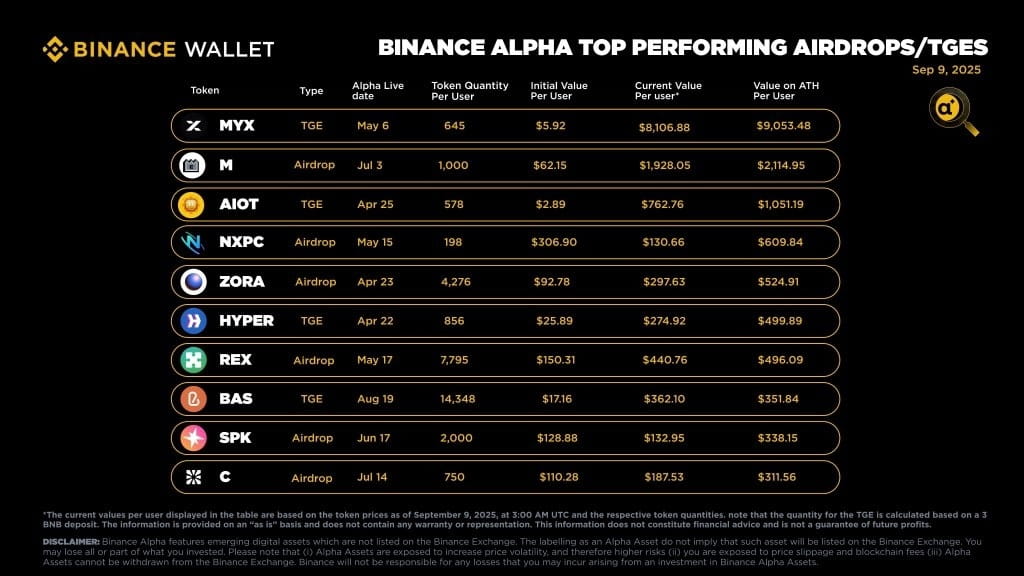 As of the data on September 3, Binance has distributed 120 Alpha project airdrops and held 40 TGE events, bringing users earnings ranging from tens to hundreds of USD. Among them, MYX has set an astonishing record of peak single-item earnings exceeding 9,000 USD, and M has also surpassed 2,000 USD. AIOT has also achieved earnings exceeding 1,000 USD. In addition to high-point events, there are also activities like Booster, which only require 61 Alpha points to participate, bringing users earnings of tens to hundreds of USD every week. For emerging users lacking market capital, these are quite good options.