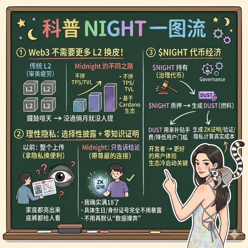 Of course, challenges are also evident. It is backed by Cardano, and the popularity of the parent chain directly affects attention; the privacy track itself has high thresholds, and cold starts take time; whether the subsidy model can turn into self-circulation is also a question mark. However, it must be said that the trend is for Web3 to move towards the physical world and compliance. In this process, being able to provide 'dignified connections'—verifiable but not naked—indeed has its unique value. Privacy is gradually no longer a geek's ideal but a cost and risk issue in reality. DYOR. Ultimately, the landing still depends on real scenarios; just telling stories is useless.#night