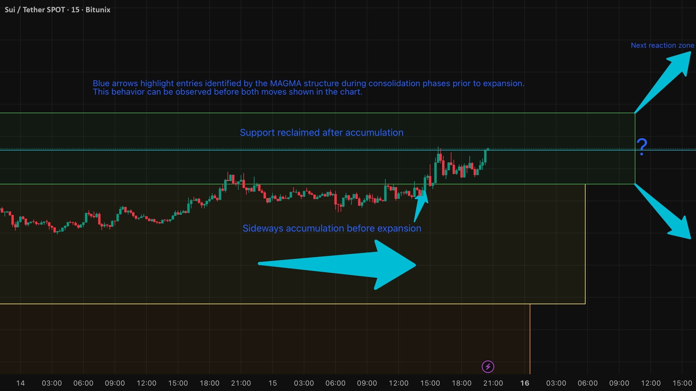 The highlighted area represents the zone where the price interacted repeatedly during the consolidation before the expansion. After reclaiming this level, SUIUSDT began to show signs of stability above support.