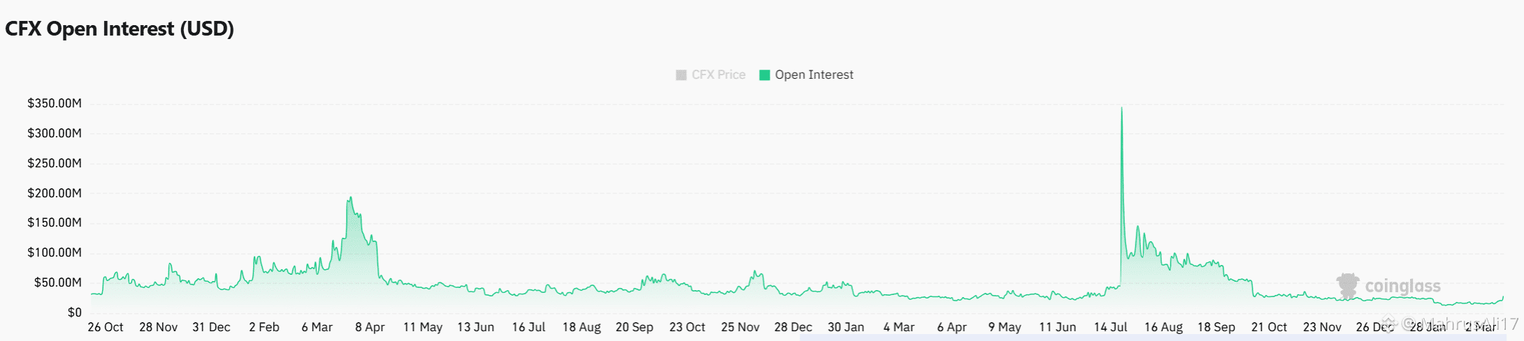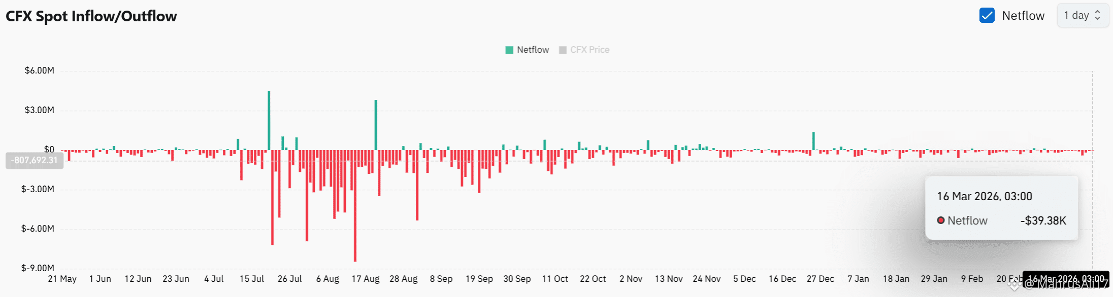 Spot flow activity has revealed persistent negative exchange netflows, indicating that CFX continued to leave trading platforms. The latest recorded netflow has shown roughly –$39.38K, reinforcing the ongoing outflow trend visible across recent weeks.