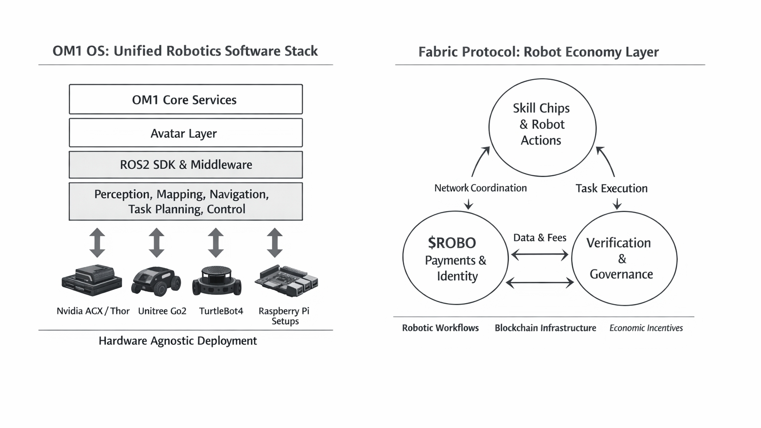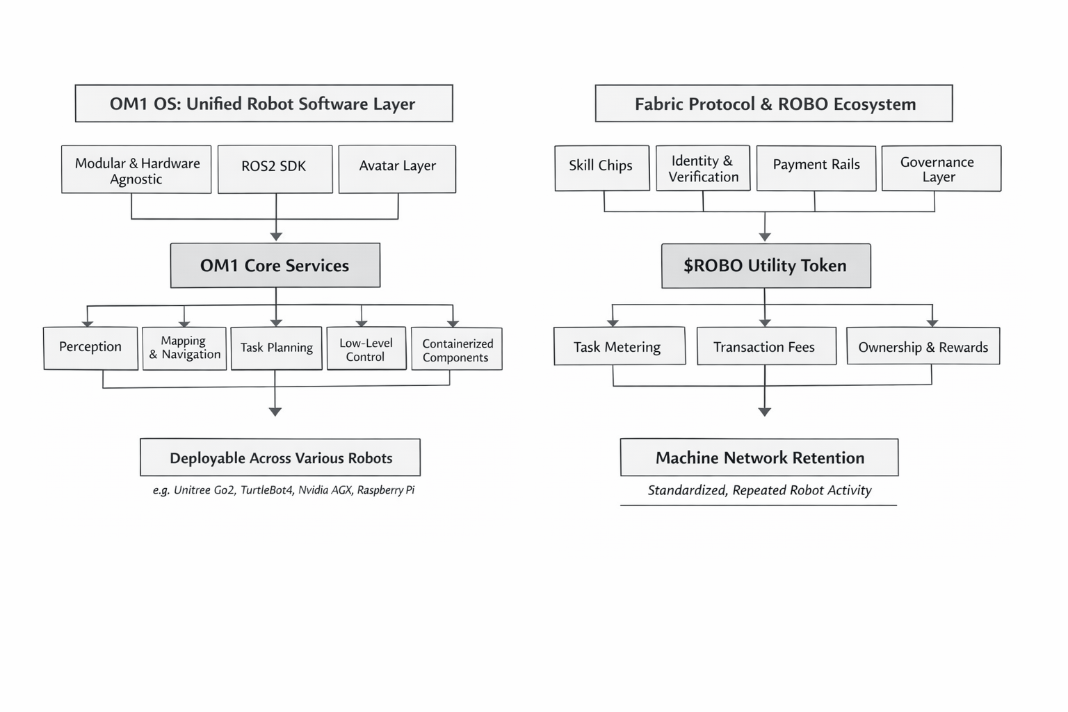 remember watching a robotics token rip for a few sessions and realizing I had no real answer to the only question that mattered after the candles cooled off. Not whether the chart looked good. Not whether the narrative sounded fresh. Just this: what keeps people, machines, and developers coming back once the first burst of attention fades? That’s why I’ve been looking at Fabric through the OM1 angle rather than the usual token angle. OM1 is not just another shiny AI wrapper. OpenMind’s current docs describe it as a modular, hardware agnostic robot OS with core services like OM1 itself, an avatar layer, and a ROS2 SDK, all packaged as containerized components that handle perception, mapping, navigation, task planning, and low level control. That matters because retention in machine networks usually lives or dies at the operating layer, where real tasks either repeat cleanly or break in annoying ways.