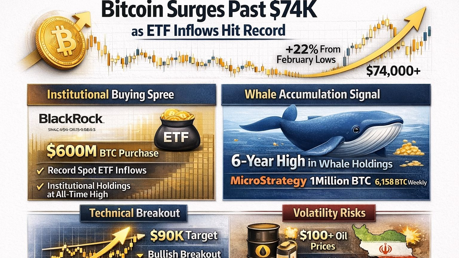 Bitcoin blasting past $74,000 feels different this time. It’s not just the headline price or a bunch of retail traders piling in for a quick win. The rally is all about institutions diving in, big holders stepping up, and a clear bullish setup on the charts. If you’re watching the crypto market, you can’t ignore this mix—it’s the kind of thing worth dissecting.