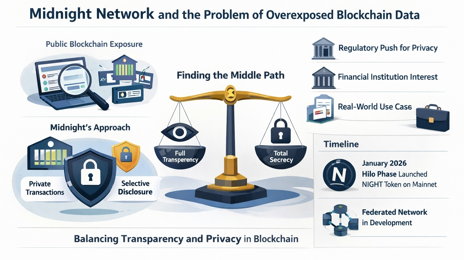 I find it helpful to look at that not as making blockchain secret but as trying to correct an old imbalance. Traditional public chains gave us shared truth but often at the cost of overexposure while older privacy focused systems pushed hard in the other direction and sometimes made regulators and institutions nervous because everything disappeared behind the curtain. Midnight’s own framing is that there is a middle path where user data and commercial data and transaction metadata can be protected while verification is preserved and disclosure stays tightly scoped for the moments when it is genuinely required.