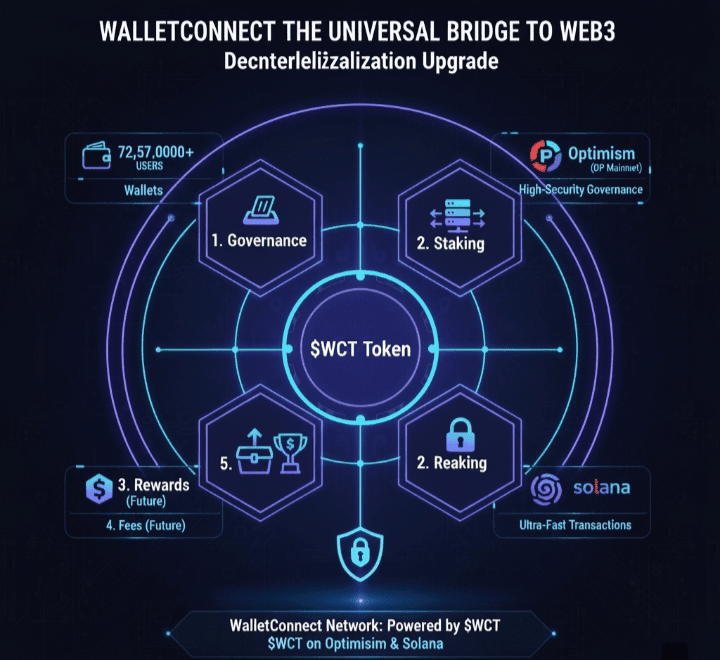 The following limits to #WalletConnect are its evolution into a fully decentralized network, supported by its native token for use and governance $WCT. This transition is not just an upgrade; it is a strategic step to ensure long-term protocol resilience, censorship resistance, and community-driven governance in an ever-changing Web3 environment. The WCT token is strategically deployed in highly active and efficient blockchain systems, specifically Optimism (OP Mainnet) for its significant governance benefits and Layer 2, and Solana for its high speed and low transaction costs. This multi-chain deployment increases the token's utility and reach, integrating it into diverse dApp environments. The WalletConnect network, powered by $WCT , is designed to enhance a more robust and democratic infrastructure, where the community can actively participate in shaping the future of the protocol through transparent voting and proposal mechanisms, surpassing centralized control to a truly distributed ownership model.