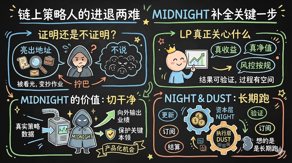 Making a strategy is not just about posting a net value screenshot once; there are updates, verifications, settlements, and subscriptions that follow. If the system is to run long-term, the underlying resources must be stable. NIGHT is placed at the capital layer, and DUST is responsible for trading and contract execution. This kind of separation at least shows one thing: it's not just about a brief excitement, but how these things can run long-term.
