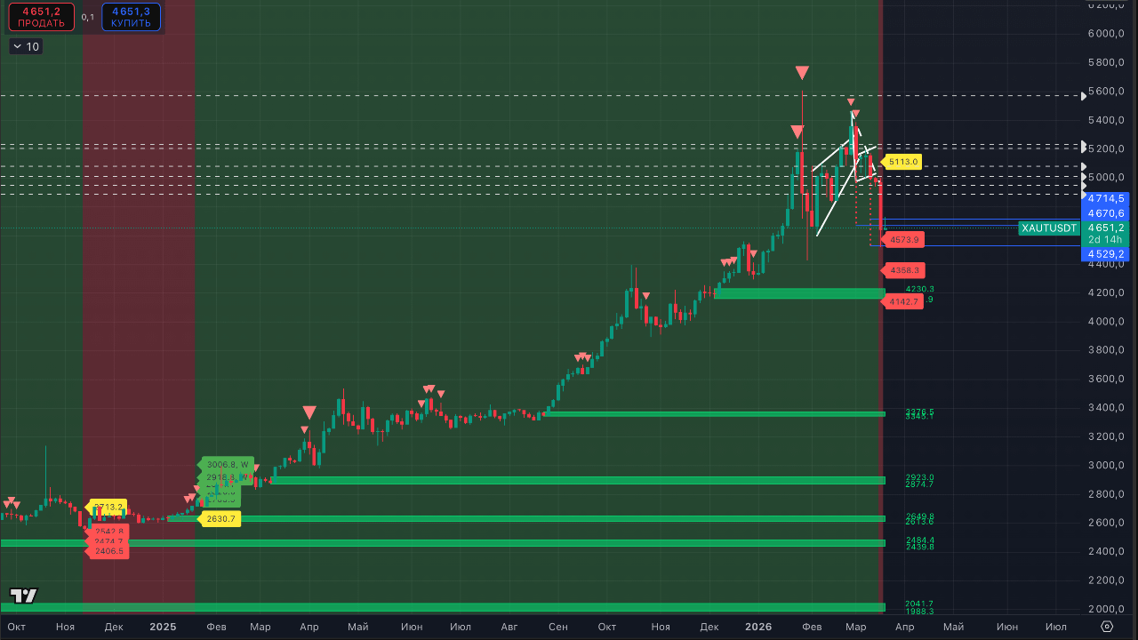 Specifically regarding gold, based on the technical picture, we expect a bounce and are loading up almost the entire deposit allocated for a long-term short on XAUT. Currently, let’s remember, the position with a 17 leverage was opened on March 6 from the level of 5 117$ due to a downtrend signal on the 12-hour TF. And so far for a small amount. Paper profit +157%. The nearest logical zone where we would like to accumulate a short with correction signals is the zone 4 822-4 840$. But for now, we placed an order closer to the next zone 4 954-4 961$. At 4 950$.