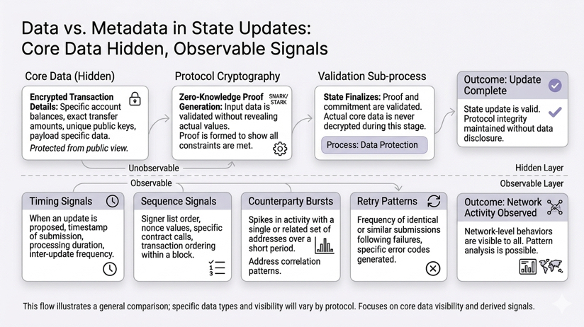 Even perfectly private smart contracts can end up leaking enough to form a picture, quietly, through the metadata.