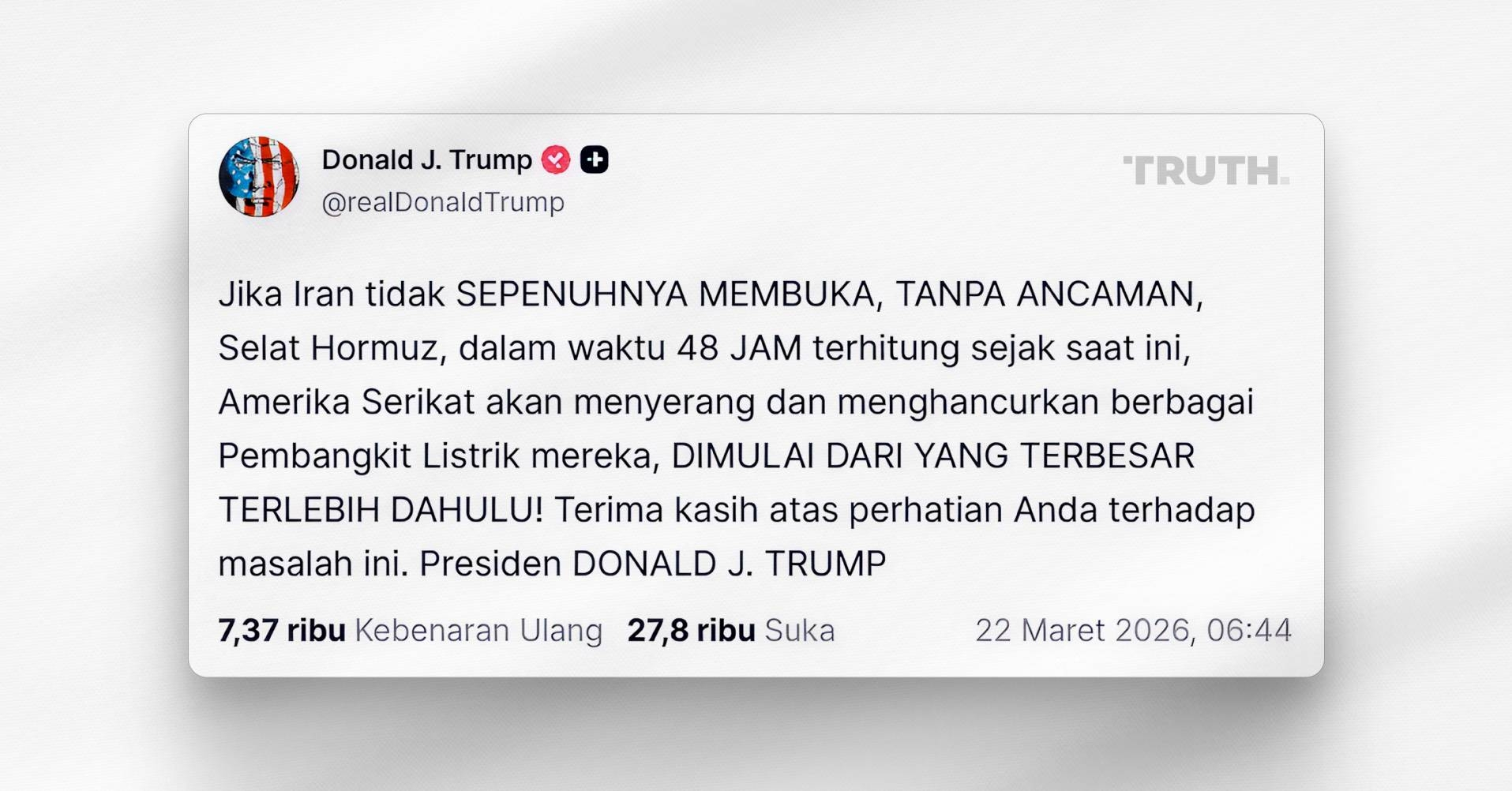 "Jika Iran tidak sepenuhnya membuka, tanpa ancaman, Selat Hormuz, dalam waktu 48 jam terhitung sejak saat ini, Amerika Serikat akan menyerang dan menghancurkan berbagai Pembangkit Listrik mereka, dimulai dari yang terbesar terlebih dahulu!," ucapnya, melansir akun Truth Social miliknya pada Minggu (22/03).