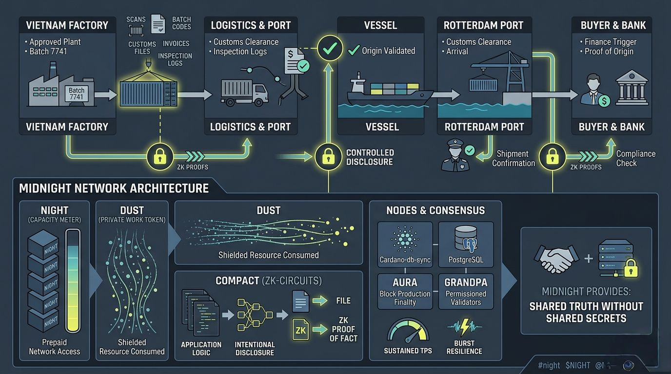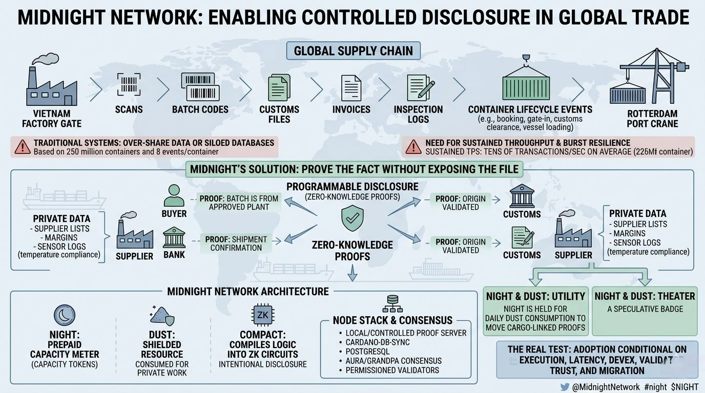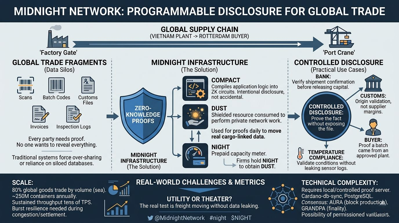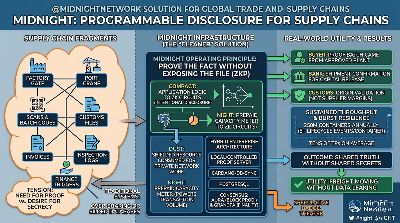 Somewhere between a factory gate and a port crane, global trade turns into fragments—scans, batch codes, customs files, invoices, inspection logs. Every party needs proof. No one wants to reveal everything. That tension is where @MidnightNetwork tries to operate.