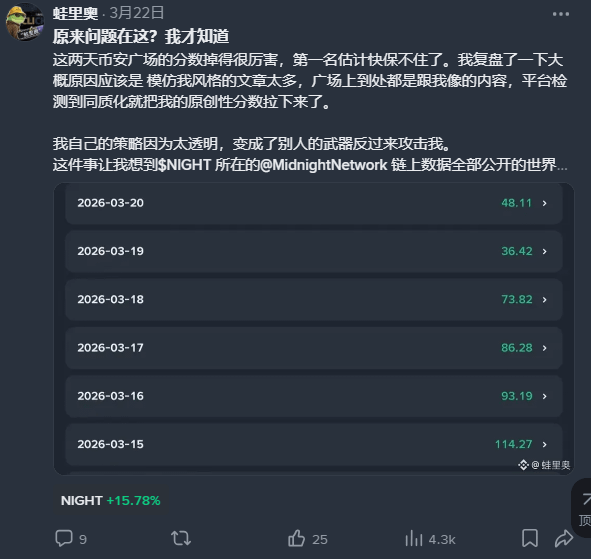 蛙里奥说了一句极度扎心的话:“我的策略太透明,变成了别人反过来攻击我的武器。”因为内容全公开,被工作室像素级模仿,反而导致自己的原创分被算法暴扣。