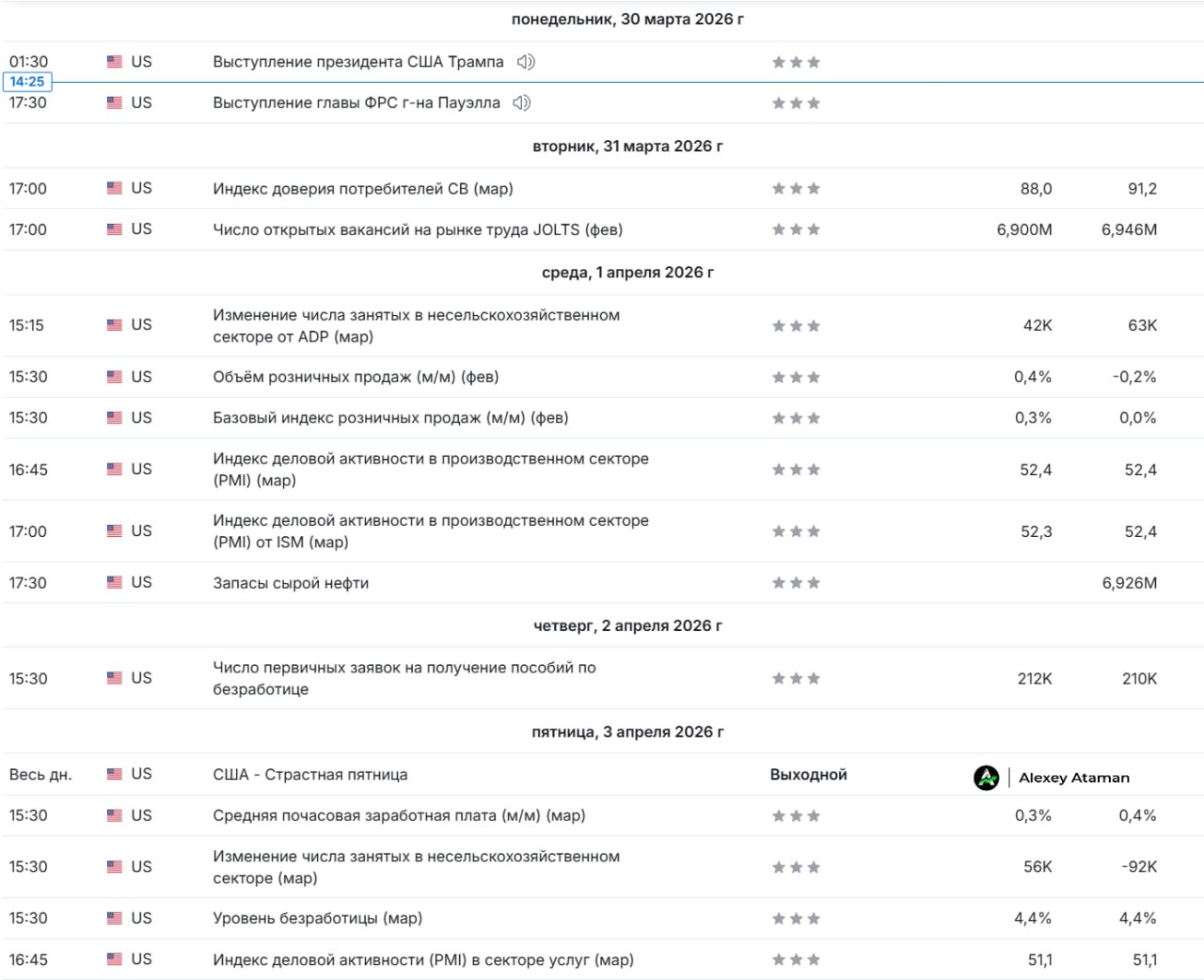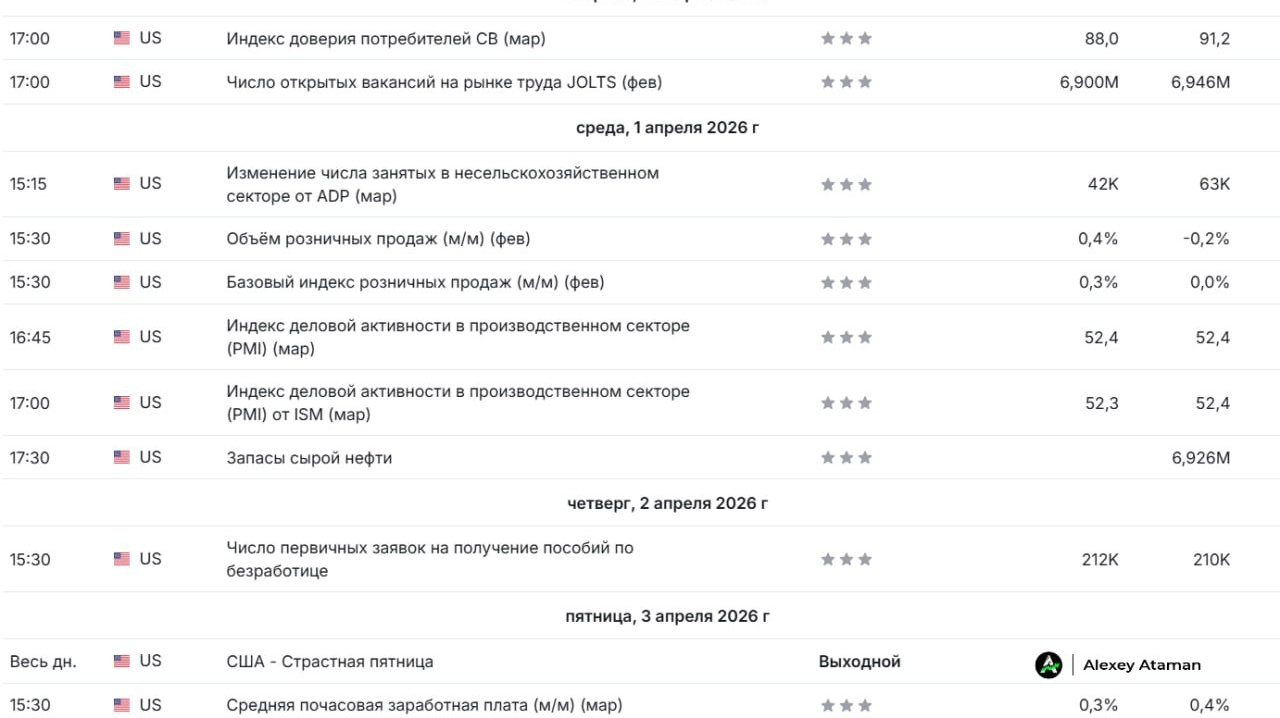 ☝️ The main risk of the week — Friday. April 3 is a public holiday in many countries (USA, Europe) — Good Friday. Exchanges are closed, but the unemployment report (NFP) will still be released. Due to low liquidity, any deviations in the numbers can lead to sharp market movements.