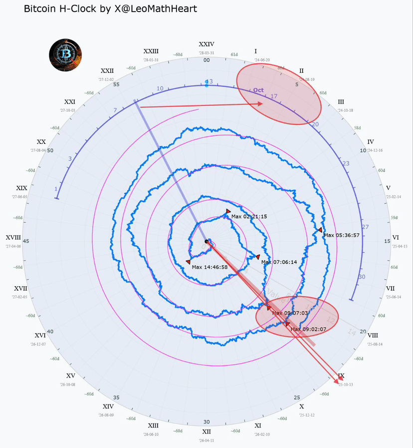The Bitcoin H-Clock, created by @LeoMathHeart, is a tool that shows Bitcoin cycles in the form of a spiral clock
