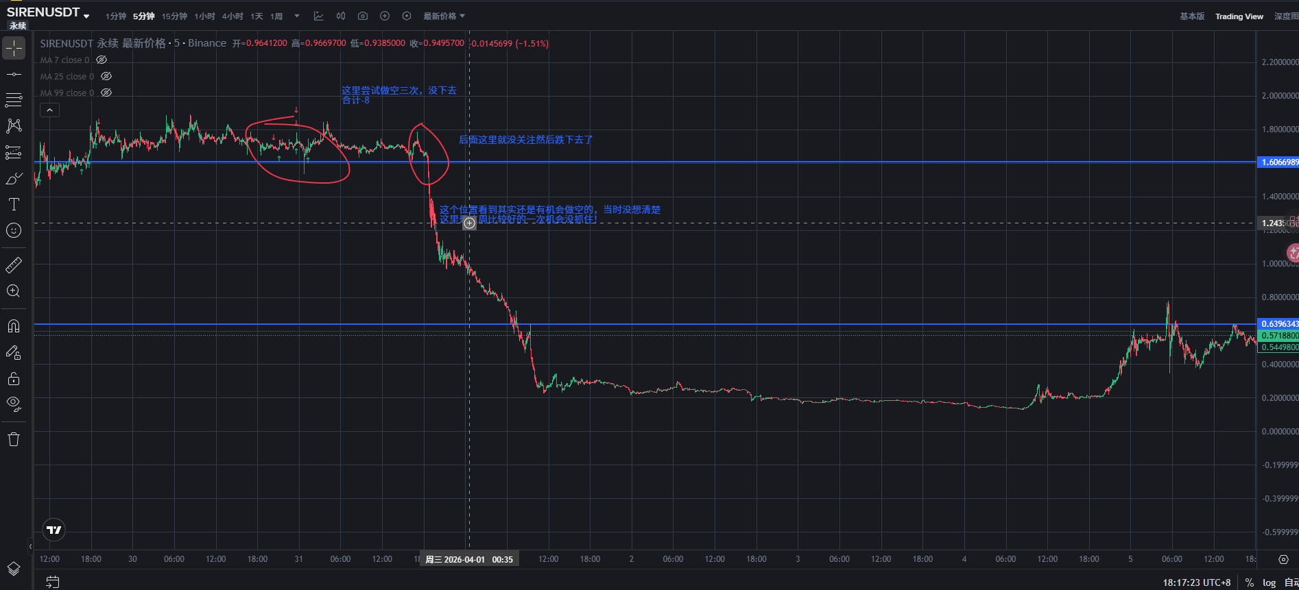 5. Siren was shorted three times while it was range-bound, didn't short down, later it went down but I didn't pay attention, however, when it dropped to -20 I saw that this was the first best opportunity to make money, but I didn't dare to open a position! -8