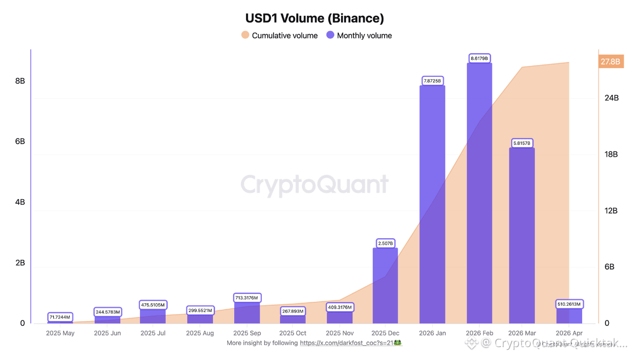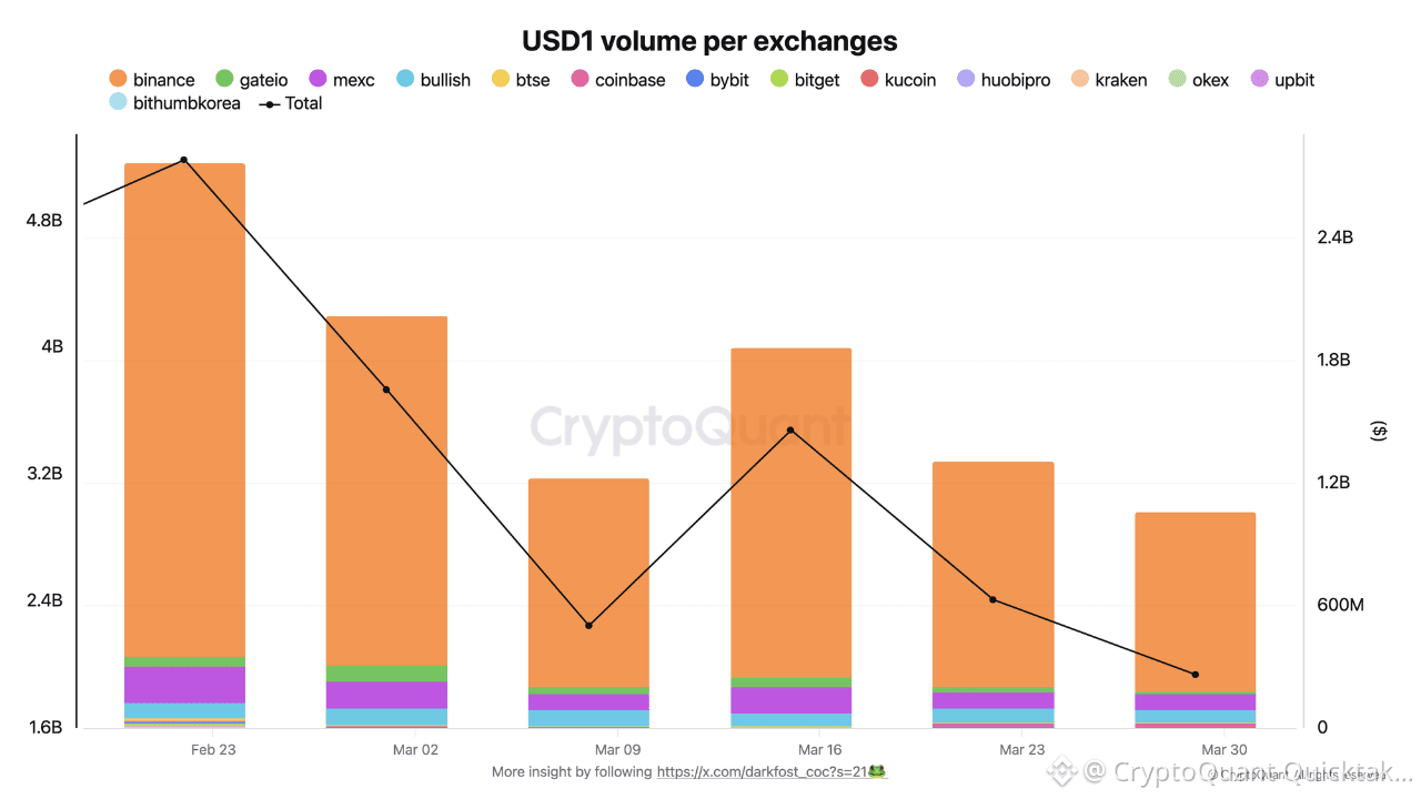 During March, USD1 volumes were largely dominated by Binance, with more than $1B traded each week on the platform.