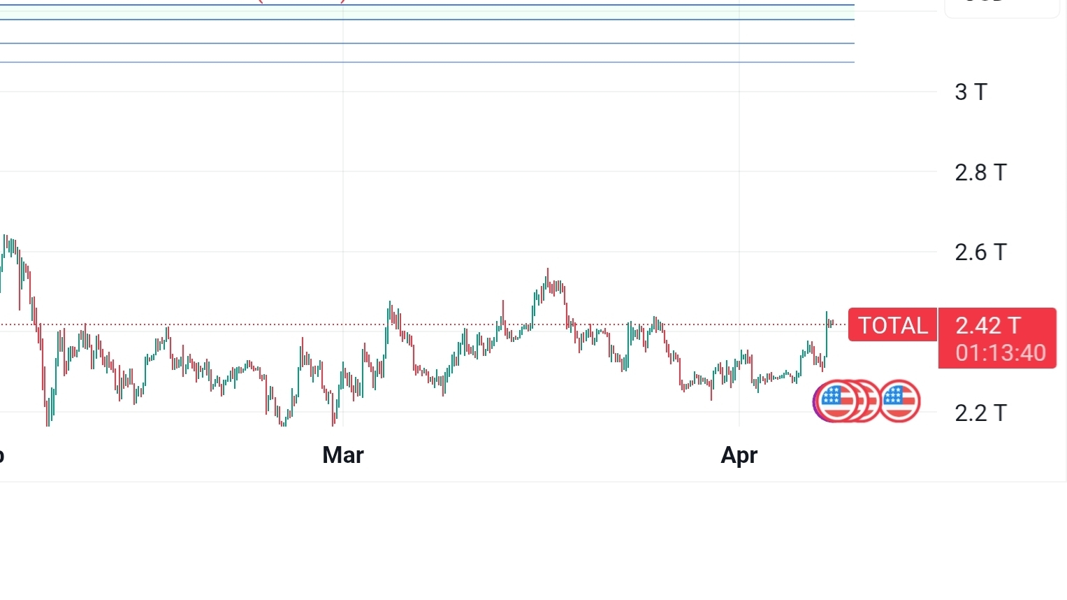 But look WHERE we're bouncing from, 2.42T. Same horizontal level that acted as support and resistance through all of Feb and March. Price has respected this dotted line multiple times. That's not a bottom signal, that's just a reaction to a known level.