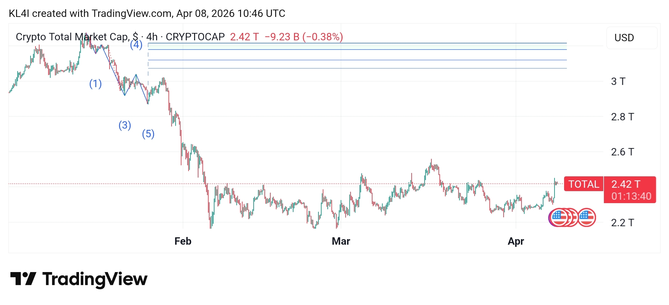 5-wave impulse down, completed. Wave 1 through 5 printed clean from January highs all the way to the 2.2T floor. That's a full bearish cycle by the book.