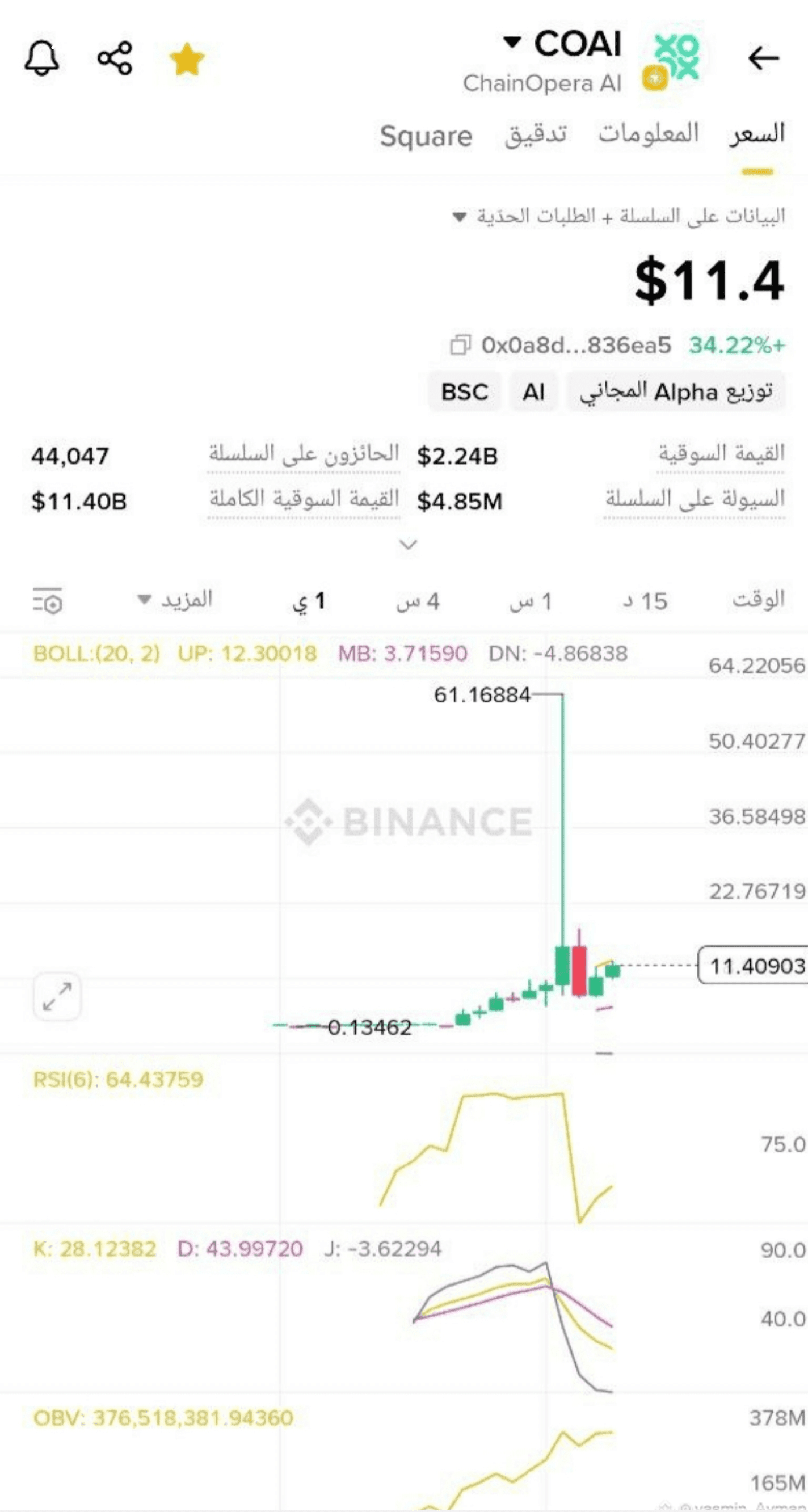 Honestly, the ChainOpera AI numbers ( $COAI ) attracted me to follow; I saw the daily increase that reached +34.22% (the price was about $11.40), but the important thing is this number: the coin started its journey just 20 days ago at a price of $0.13. This calls for a pause and analysis of the project's fundamentals.