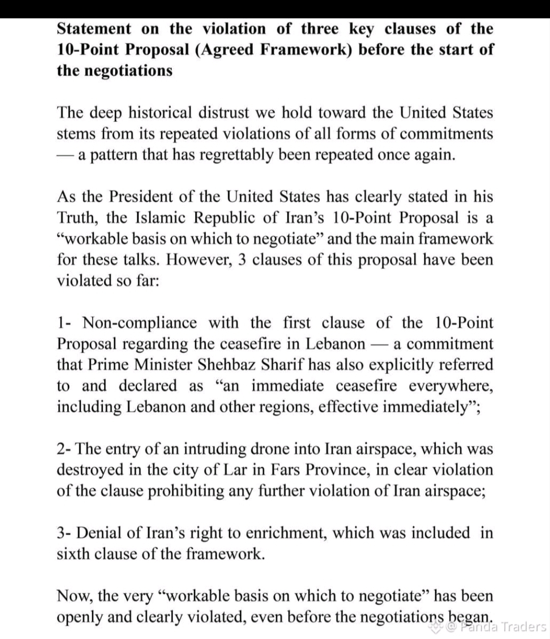 Qalibaf mentioned the violation of three specific clauses that undermine the fundamental basis of the proposal. The first clause relates to an immediate and unlimited ceasefire in Lebanon. It includes a demand from Pakistani Prime Minister Shehbaz Sharif that an immediate ceasefire should occur in Lebanon and other areas. However, Israeli attacks continued, which are considered impossible without American support. The second clause pertains to Iran's air office, where a clear violation occurred in the city of Lar in Fars province by drone. This drone was destroyed, which contradicts the explicit prohibition of the proposal. The third clause extends to the sixth part of the proposal, which grants Iran the right to produce uranium dark matter. America has rejected this right, weakening the entire proposal. All these events occurred not during the negotiations but before them, which forces Qalibaf to state that 'the basis for negotiation was destroyed'.