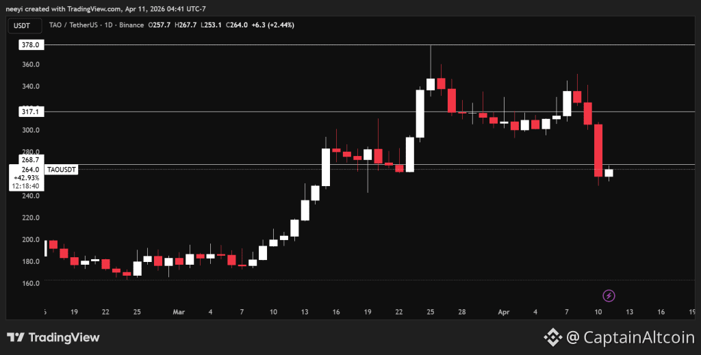 Technical structure now gives a mixed picture. TAO trades around $264 at the moment, and that places it close to an important support region. Strong support appears near $268 and extends toward $300 if recovery builds strength.