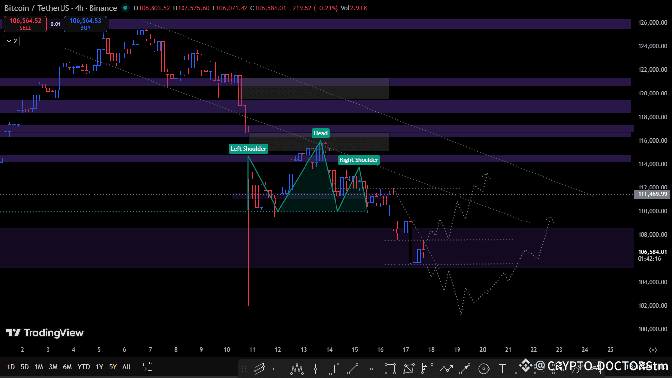 A clean (HEAD AND SHOULDERS) pattern was spotted on the 4Hrs chart. And and it played out well.What i am seeing for now is the liquidity have been sweapt completly, and the wick is almost 80% covered, and i i expect some upward momentum from here. But its recomended to look out for a proper breakout above (107,568) to target higher resistances at (109,200-110,450-11,870) or a breakdown bilow (105,480) to target lower supports at (104,518-103,557-102,094) final target. To cover the remaining 20% of the wick.