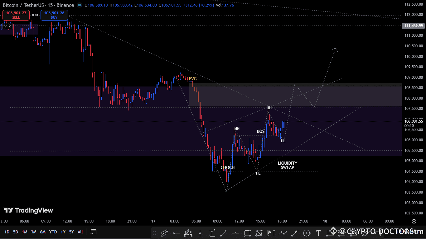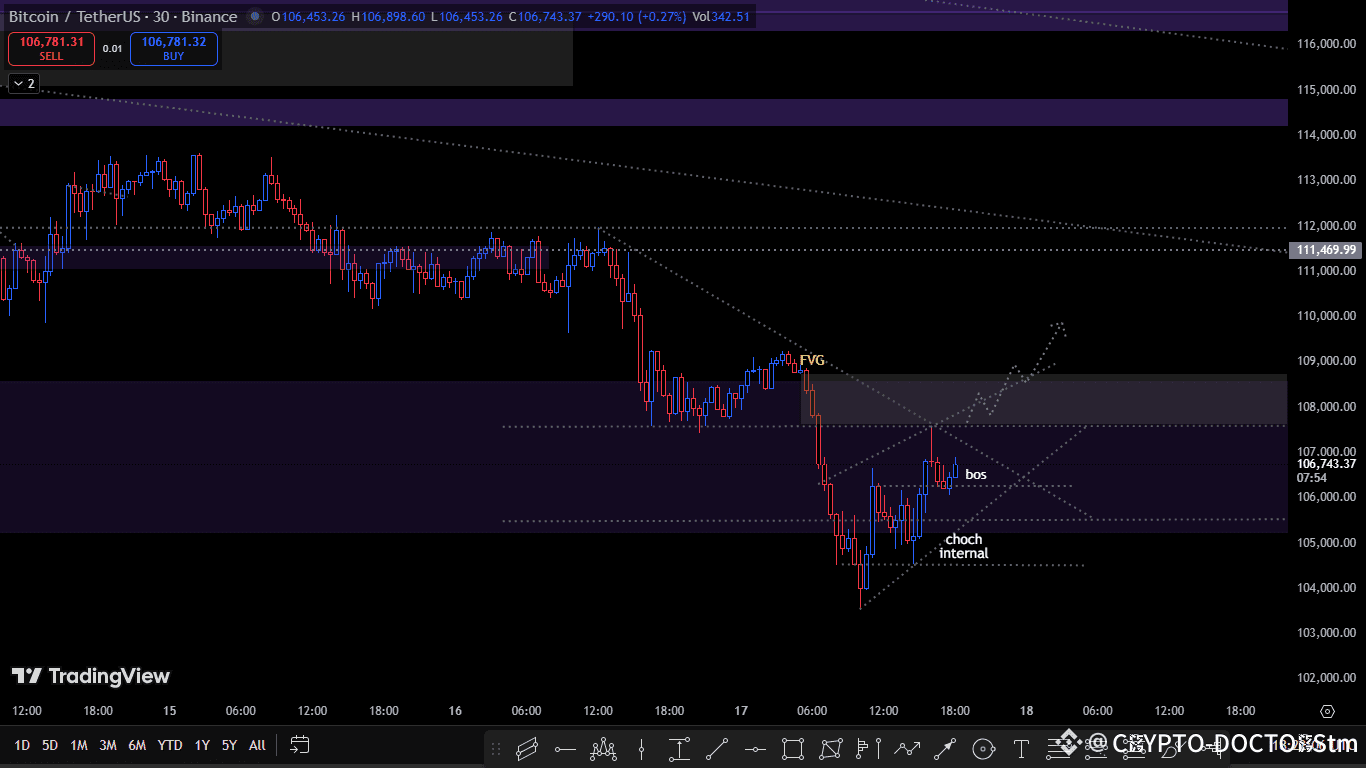 Bitcoin already tested a perfect Bullish order block and what i am seeing here is that prices are already making higher highs (internal) but the market is still in chaos we need a perfect breakout above (107,695) to confirm a (CHOCH) and plus local resistance breakout then we can target the upper resistances respectively. A 30 minutes candle close above the (FVG) will confirm a clear bullish momentum.