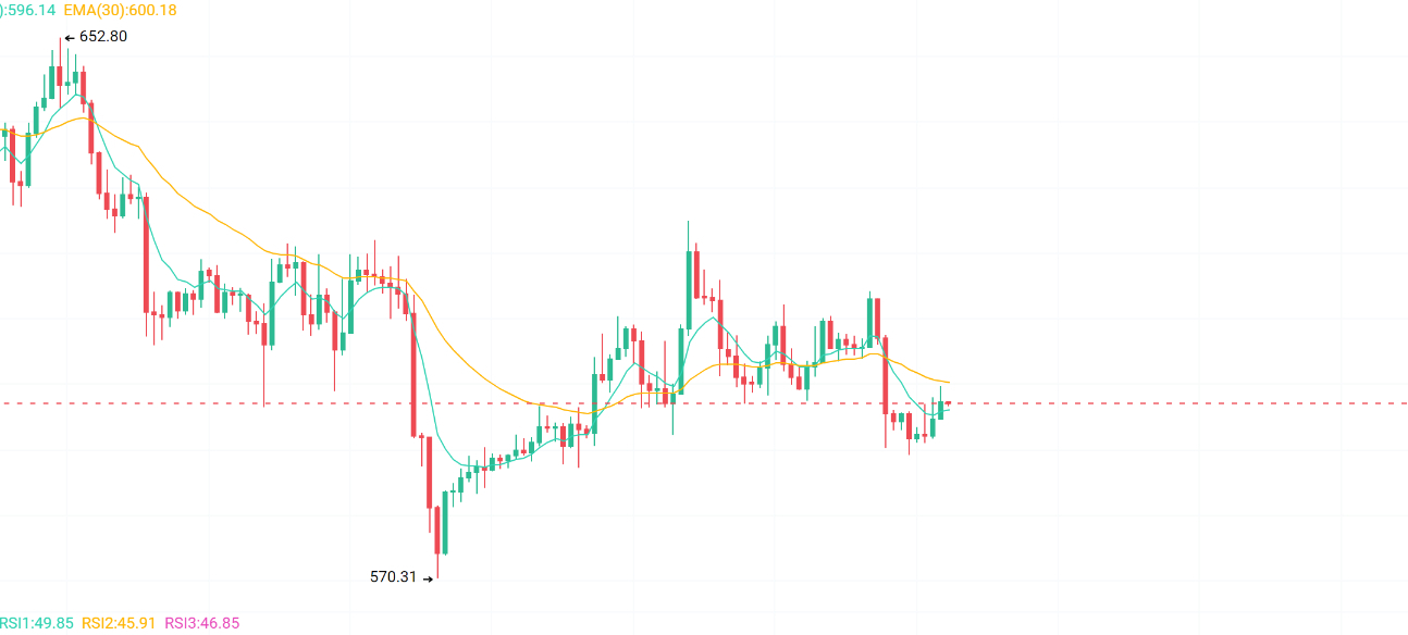 Finally, let's briefly look at BNB. The current price is around 596 USD, and it is overall in a phase of oscillation and consolidation. Technically, the trend strength has gradually increased but is still under pressure from the 50-day moving average. There is support around 575, with greater pressure above at around 670 USD. In the short term, it is likely to remain in a phase of oscillation and accumulation, waiting for new directional choices.