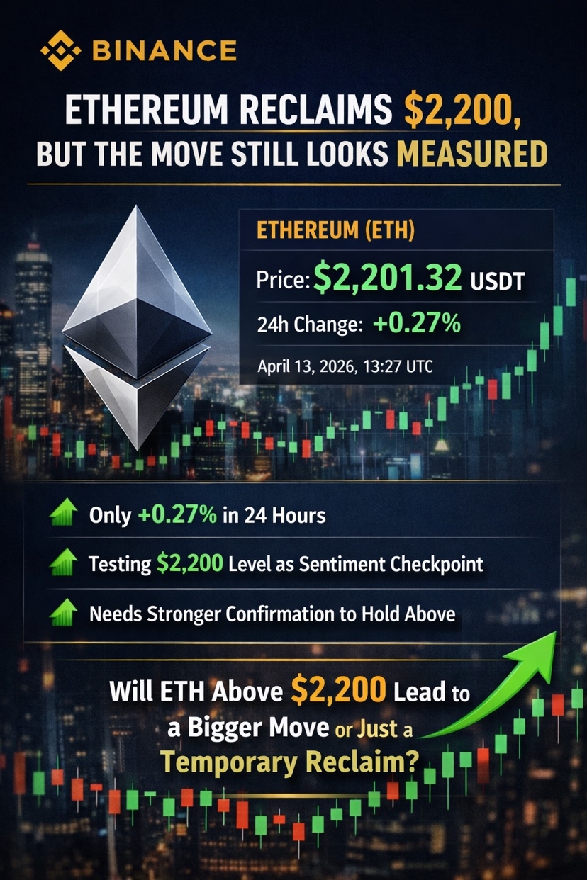 Ethereum (ETH) has moved back above the 2,200 USDT level, trading around 2,201.32 USDT as of April 13, 2026, 13:27 UTC, according to Binance Market Data. On the surface, that sounds like a strong milestone, but the broader picture is more nuanced.#Write2Earn