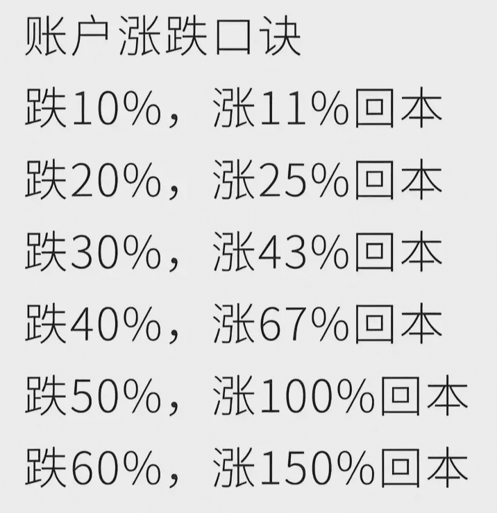 If your account balance drops by 10%, meaning you've lost 10%, you need to earn 11% to break even. If it drops by 20%, you need to earn 25%. If your account loses 70%, it needs to gain 233% to break even.