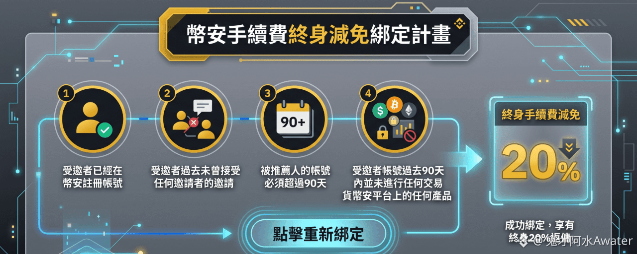 In recent years, Brother Shui has been educating newcomers in the cryptocurrency space and often encounters users who, due to early registration on Binance, did not pay attention to the fee waiver, resulting in a higher long-term cost compared to others. Now, Binance has launched the 'Rebinding Activity,' where users can rebind fee waivers and obtain a lifetime 20% reduction opportunity as long as they meet the relevant conditions.